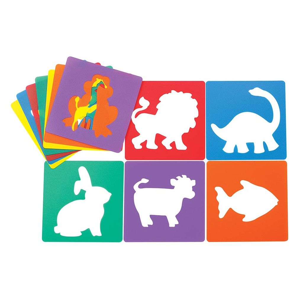 Šablony s motivy zvířat jsou vyrobeny z odolného a omyvatelného plastu. Můžete je použít různými kreativními způsoby, pro kreslení vnějších nebo vnitřních kontur, jakož i pro malování či houbu. Balení obsahuje motivy v různých barvách – lev, ryba, dinosaurus, zajíc, kráva a jiné. Rozměr: 20,5 x 20,5 cm. Materiál: plast. Věk: 3+.