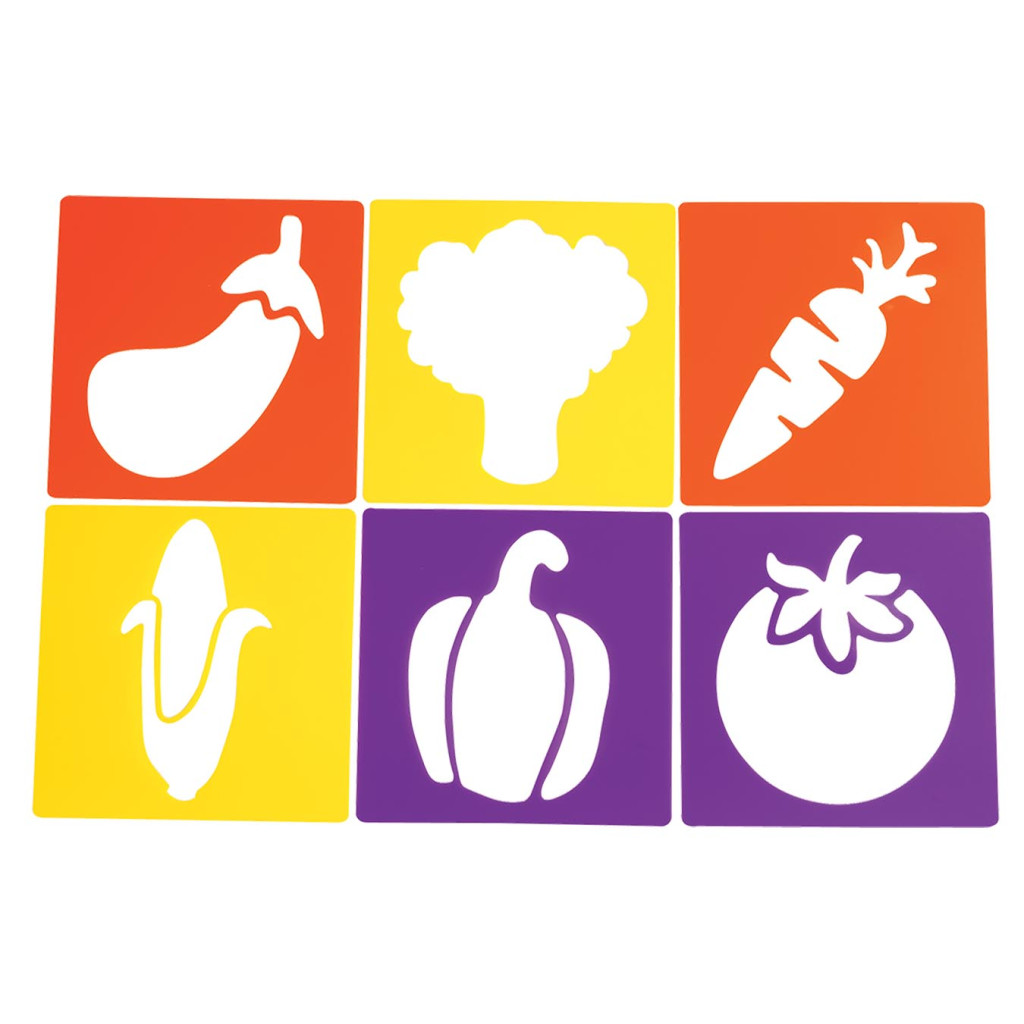 Šablony s motivy ovoce a zeleniny jsou vyrobeny z odolného a omyvatelného plastu. Můžete je použít různými kreativními způsoby, pro kreslení vnějších nebo vnitřních kontur, jakož i pro malování či houbu. Balení obsahuje 12 motivů v různých barvách – jahodu, kukuřici, jablko, hrušku, papriku a jiné. Rozměr: 20,5 x 20,5 cm. Materiál: plast. Věk: 3+.