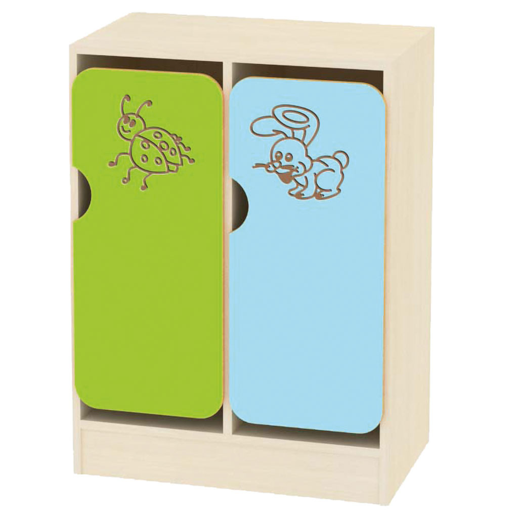 Šatny jsou vyrobeny z 18 mm DTD desky, která má zaoblenou ABS bezpečnostní hranu o tloušťce 2 mm. Dvířka jsou vyrobena ze 12 mm MDF desky, mají zaoblenou hranu. Na dvířka lze frézovat vzory, na výběr máte 92 motivů. Každá přihrádka má dva dvojité háčky, které jsou umístěny naproti sobě. Na požádání, za příplatek 80 Kč na jednu buňku, můžeme vyrobit šatnu is tyčí na ramínko. V tom případě za kód připište písmeno T. Na výběr máte korpus javor nebo buk