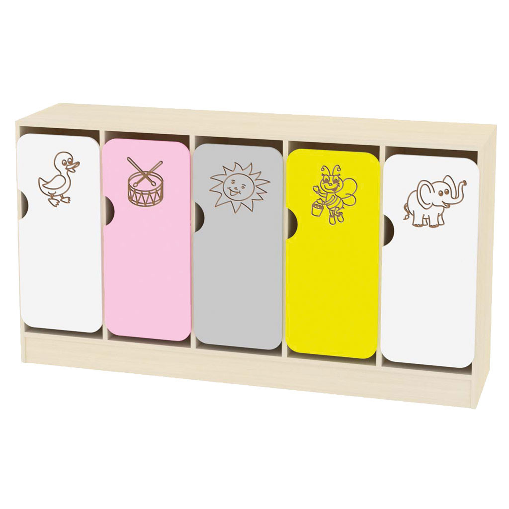 Šatny jsou vyrobeny z 18 mm DTD desky, která má zaoblenou ABS bezpečnostní hranu o tloušťce 2 mm. Dvířka jsou vyrobena ze 12 mm MDF desky, mají zaoblenou hranu. Na dvířka lze frézovat vzory, na výběr máte 92 motivů. Každá přihrádka má dva dvojité háčky, které jsou umístěny naproti sobě. Na požádání, za příplatek 80 Kč na jednu buňku, můžeme vyrobit šatnu is tyčí na ramínko. V tom případě za kód připište písmeno T. Na výběr máte korpus javor nebo buk