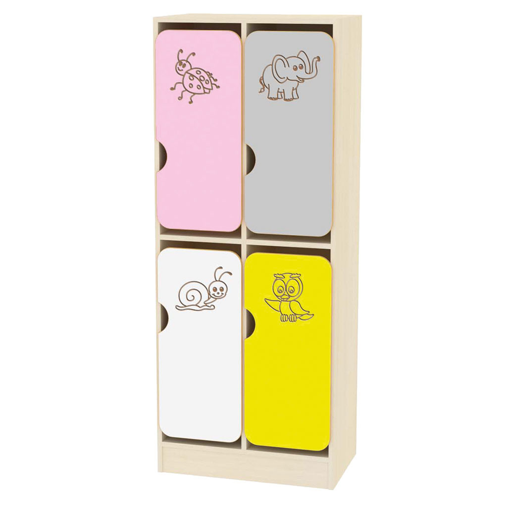 Šatny jsou vyrobeny z 18 mm DTD desky, která má zaoblenou ABS bezpečnostní hranu o tloušťce 2 mm. Dvířka jsou vyrobena ze 12 mm MDF desky, mají zaoblenou hranu. Na dvířka lze frézovat vzory, na výběr máte 92 motivů. Každá přihrádka má dva dvojité háčky, které jsou umístěny naproti sobě. Na požádání, za příplatek 80 Kč na jednu buňku, můžeme vyrobit šatnu is tyčí na ramínko. V tom případě za kód připište písmeno T. Na výběr máte korpus javor nebo buk