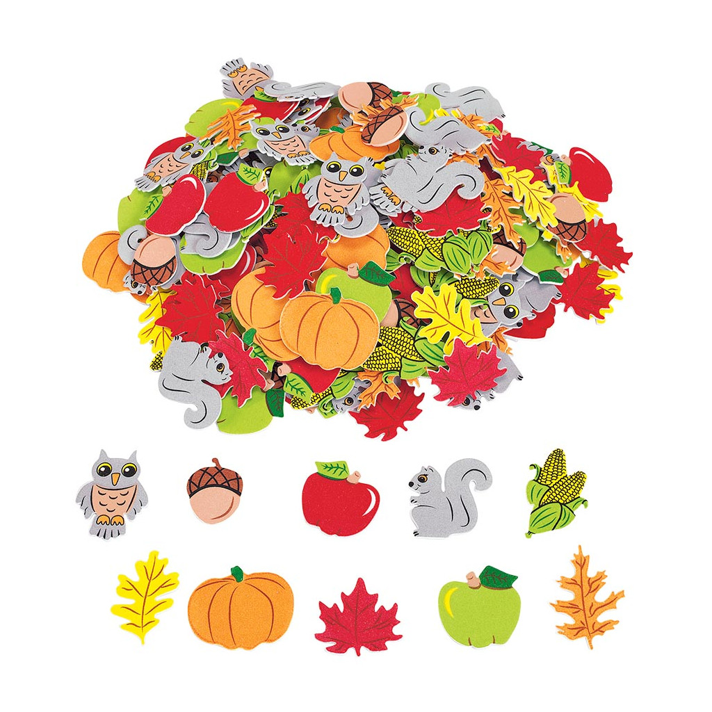 Všechny podzimní motivy v jednom praktickém balení. Tvary zahrnují sovu, zelené jablko, červené jablko, žalud, dýni, kukuřici, veverku a tři druhy podzimních listů. Jasné, detailní obrázky na samolepící pěně EVA jsou ideální pro jakékoli sezónní zdobení. Nálepky jsou netoxické a bezpečné pro děti. Balení obsahuje 300 ks. Rozměry: cca 4 x 4 cm. Materiál: EVA. Věk: 3+.