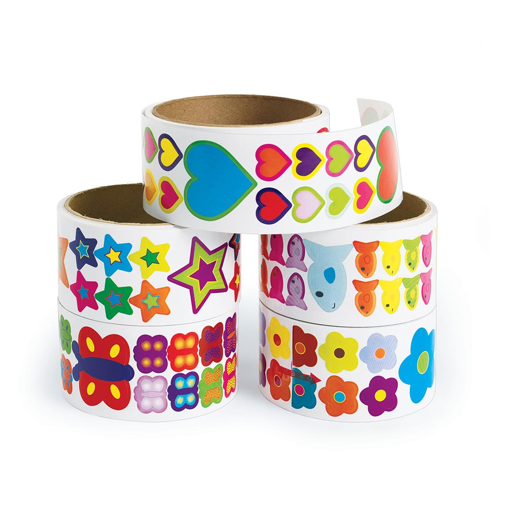 Set samolepek obsahuje 5 rolí, každá role obsahuje přibližně 188 nálepek různých vzorů. Vzory zahrnují motýli, květiny, hvězdy, srdíčka a rybičky. Nálepky jsou s netoxickým lepidlem a bez latexu. Lehce se odlepují a lepí na většinu povrchů. Materiál: papír. Rozměry: 1,5 - 4 cm. Věk: 3+.