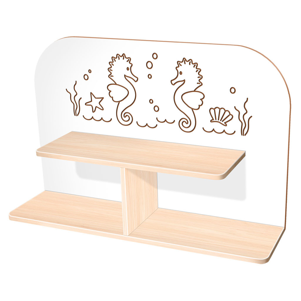 Dekorační police jsou vyrobeny z DTD desky o tloušťce 18 mm, dekorační zadní část je z 12 mm MDF desky. Police mají bohatý úložný prostor, hloubku od 25 cm a šířku až 1 m. Policová část se vyrábí ve dvou druzích dřevodekoru - javor nebo buk. Dekorační police jsou nejen praktické, zároveň jsou velmi pěkným doplněním dětské herny. Můžete je použít jako samostatný kus nábytku, nebo jako součást nábytkových sestav.