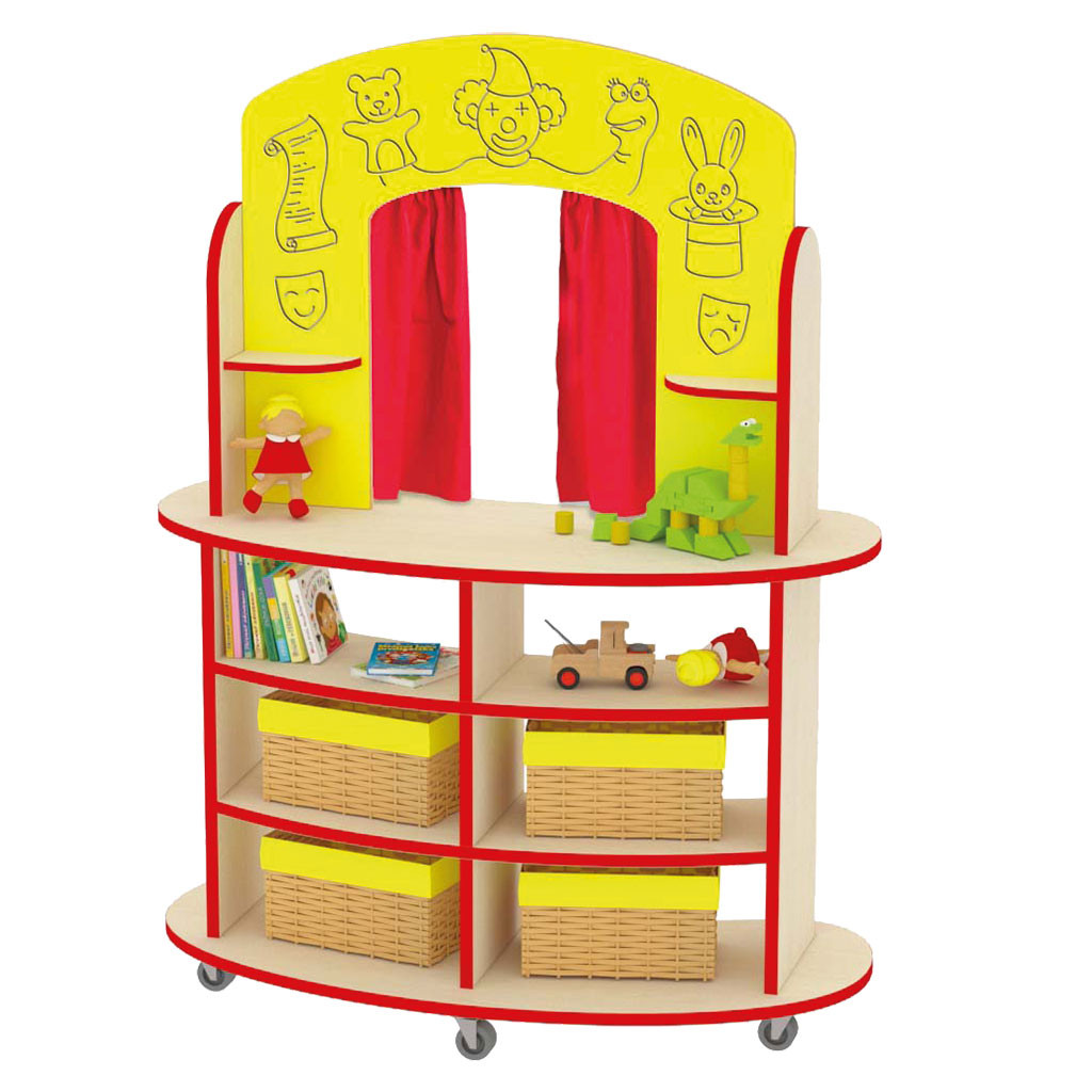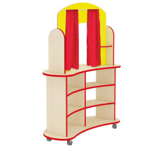Divadlo je vyrobeno z 18 mm DTD desky, která má zaoblenou ABS bezpečnostní hranu o tloušťce 2 mm. Zadní panel je z 12 mm MDF desky. Stolek je na kolečkách, součástí je tyč a červený závěs. Vybrat si můžete korpus javor nebo buk.
