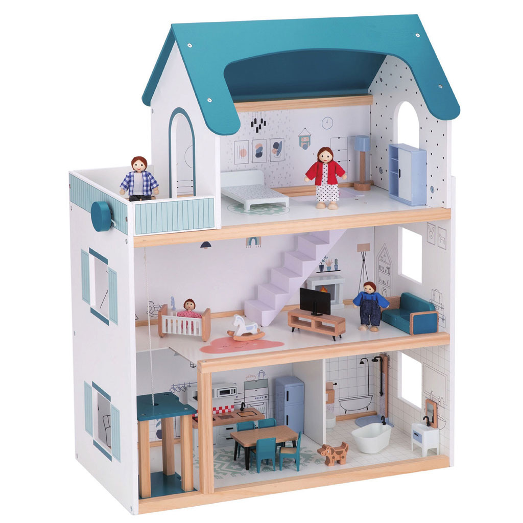Domek má prostorné pokoje, kde najdete vše, co je v moderní domácnosti zapotřebí – kuchyni, koupelnu, ložnici s balkonem, obývací pokoj a dokonce i funkční výtah. Na výrobu domku bylo použito dřevo, které nebylo vytěženo nelegálně a pochází z lesů obhospodařovaných šetrným či přírodě blízkým způsobem, ve kterém jsou dodržovány přísné environmentální a sociální požadavky. K domku patří také 25 ks příslušenství včetně postaviček rodiny. Rozměry: 61,5 x 80 x 29,5 cm. Materiál: dřevo/plast. Věk: 3+.