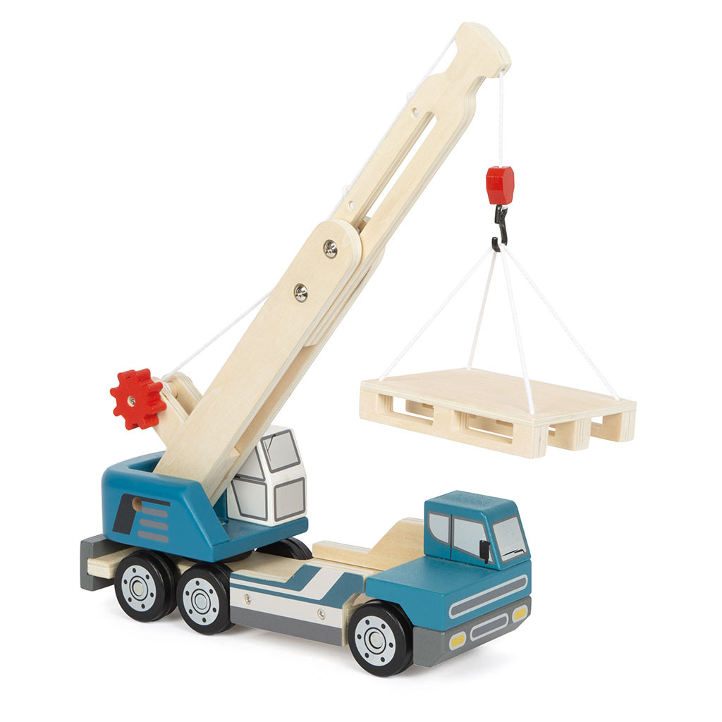 Díky jeřábu, který se otáčí o 360 stupňů a prodlužovacímu ramenu s hákem, tento robustní nákladní automobil usnadňuje dosažení výšek, aby bylo možné bezpečně přesouvat a přepravovat náklady. Hák s paletou na konci ramene jeřábu lze snadno ovládat ruční klikou. Pogumované pneumatiky s tichým chodem zajišťují tichý a jemný pohyb vozidla. Tento jeřábový nákladní automobil je stabilní. Manévrování a obsluha jeřábového nákladního auta zlepšuje koordinaci ruka - oko. Hra s tímto autíčkem také podporuje sociální sounáležitost, když děti společně plánují a přebírají své vlastní stavební projekty. Rozměry: 30 x 8 x 14 cm, výška zcela vysunutého žebříku: cca 42 cm, paleta 11 x 8 x 2 cm. Materiál: dřevo. Věk: 2+.