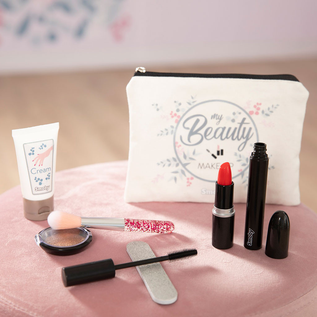 Sada se skládá z kosmetické taštičky se 7 doplňky - řasenka, rtěnka, oční stíny, štětec, pilník a krém. Veškeré příslušenství nejsou skutečné produkty. Rozměry: 18 x 2 x 13 cm.