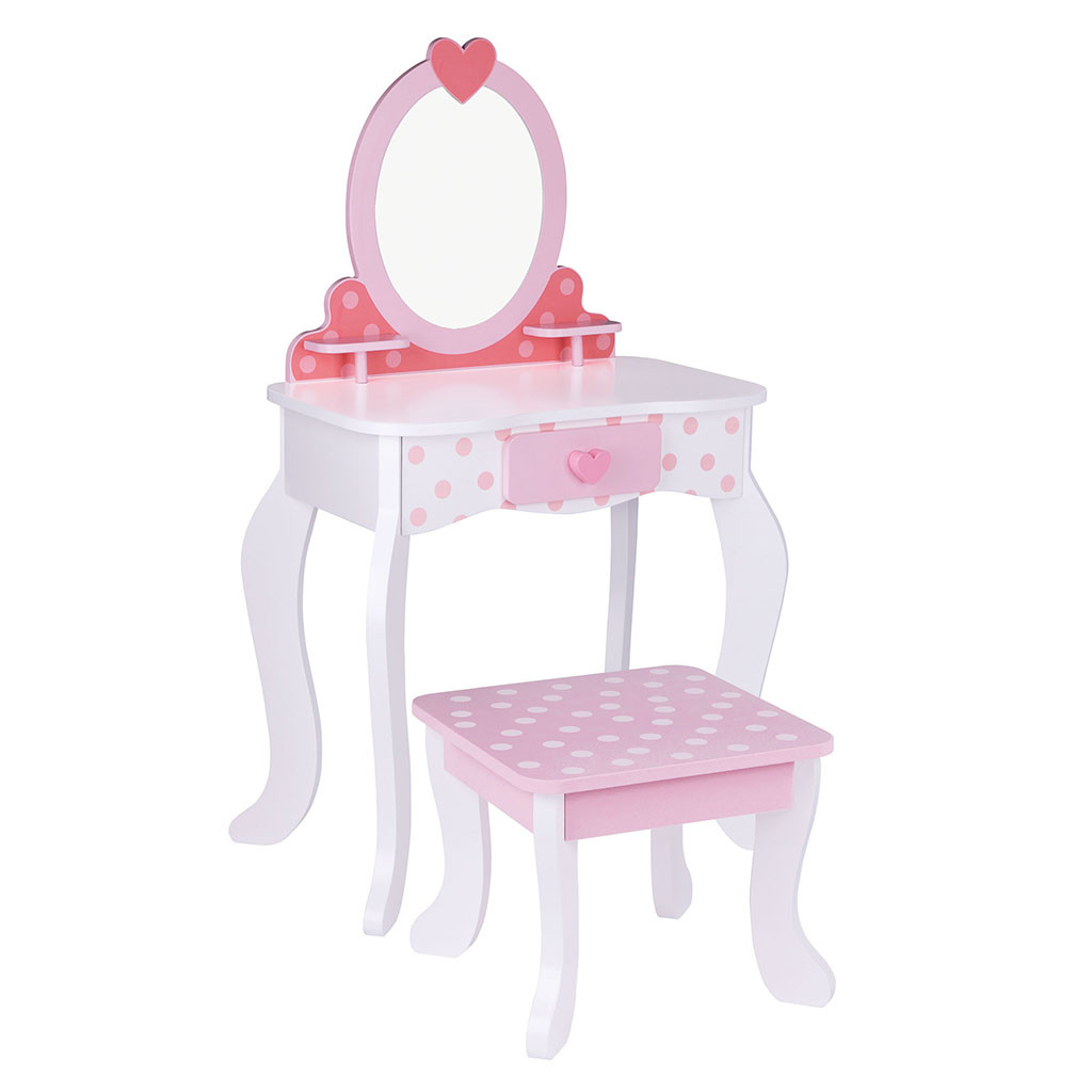 Kosmetický stolek se zrcadlem a židlí. Zásuvka slouží k odkládání šperků, kosmetiky a pod. Příslušenství není součástí balení. Rozměry: 52 x 30 x 84,5 cm. Materiál: dřevo. Věk: 3+.