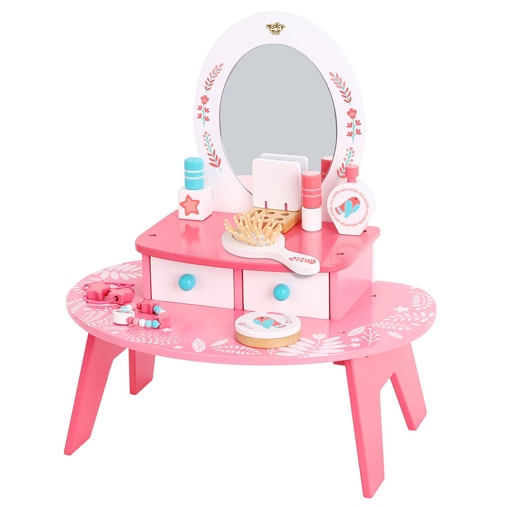 Dřevěný toaletní stolek pro děti se zájmem o módu. Kromě zrcadla má kosmetický stolek také úložné prostory v podobě 2 zásuvek a 2 odkládací poličky. S úklidem všech doplňků – rtěnky, laku, pudřenky, zrcátka, kartáče na vlasy, gumičky, náramku či parfému – tak problém nebude. Obsahuje 16 ks. Rozměry: 41,5 x 28 x 10,3 cm. Materiál: dřevo. Věk: 3+.