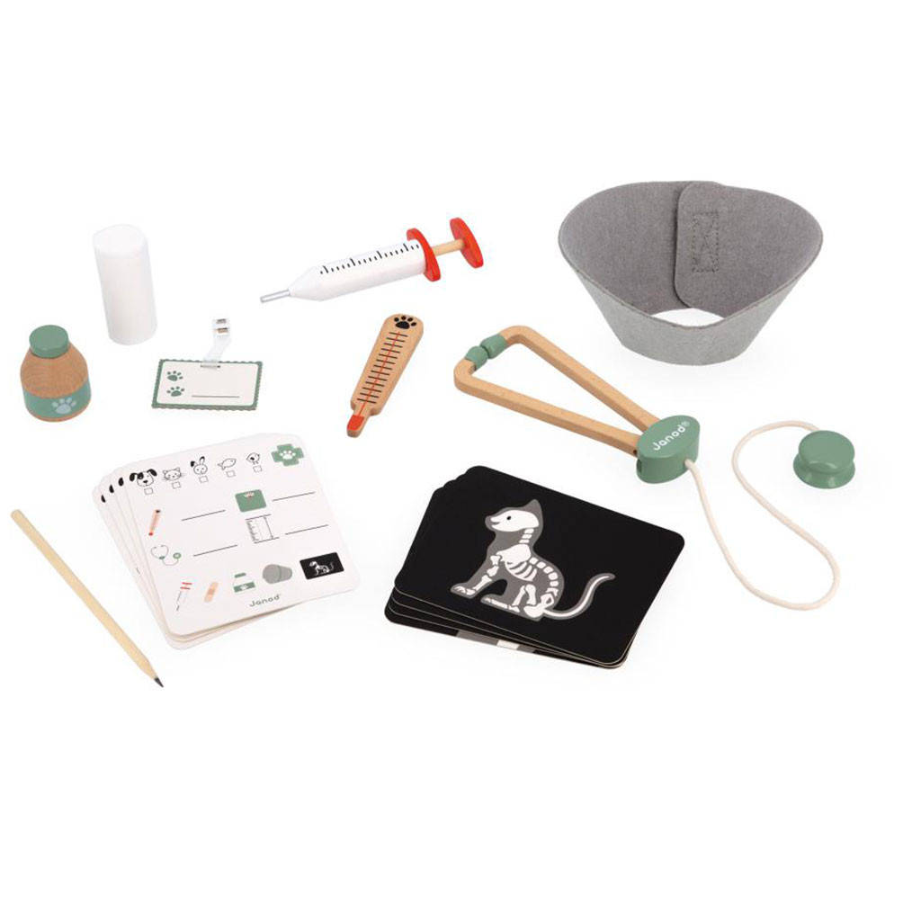 S kufříkem plným veterinárních doplňků si děti rozvíjejí představivost, empatii a učí se starat o zvířátka. Jelikož laskavost se učí už od útlého věku a některé lékařské zákroky mohou děti často vystrašit, hraním si na veterináře si mohou představit sami sebe jako lékaře. Sada obsahuje 16 doplňků: visačku, 4 kartičky s „předpisem“, 4 rentgenové snímky (kočka, králík, ryba a detailní pohled na kost), tužku, obvaz, plstěný límec, stetoskop, injekční stříkačku, teploměr a kelímek masti. Kufřík je na zip, takže nic z lékařského vybavení se nemůže ztratit. Rozměry: 21,6 x 9,5 x 16,5 cm. Materiál: dřevo/textil/karton. Věk: 3+.