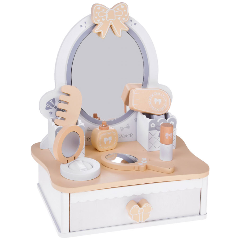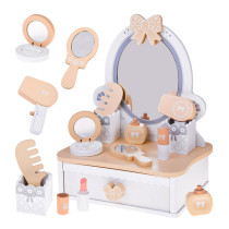 Tento toaletní stolek si najde své místo také v menší třídě. Díky kompaktním rozměrům jej lze umístit na stůl. Je vyroben z masivního dřeva v elegantních a příjemných barvách. Mašle zdobící stolek mu dodávají milý vzhled. Zaoblené tvary a netoxická barva jsou pro děti naprosto bezpečné. Toaletní stolek se dodává se dvěma dřevěnými krabičkami, které jsou ideální pro uložení drobných předmětů, jako jsou dětské šperky nebo vlasové doplňky. Toaletní stolek má také prostornou zásuvku s dalšími doplňky. Sada obsahuje: toaletní stolek se zrcadlem a šuplíkem, 2 dřevěné krabičky na drobnosti, zrcadlo s rukojetí, fén, hřeben, pudřenku se zrcátkem, parfém, rtěnku. Stolek je dodáván rozložen, jeho montáž je jednoduchá. Rozměry balení: 36 x 28 x 16 cm. Materiál: dřevo. Věk: 3+.