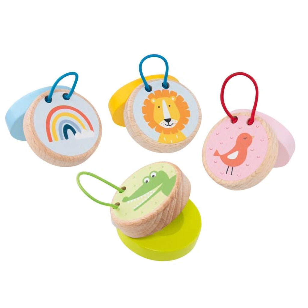 Barevné kastaněty s milými obrázky jsou perfektní pro úvod do světa hudby. Děti se s nimi naučí základy rytmu a také jim pomohou rozvinout dovednost, jemnou motoriku a koordinaci. Sada obsahuje 12 ks. Rozměry: 5 x 5 cm. Materiál: dřevo. Věk: 3+.