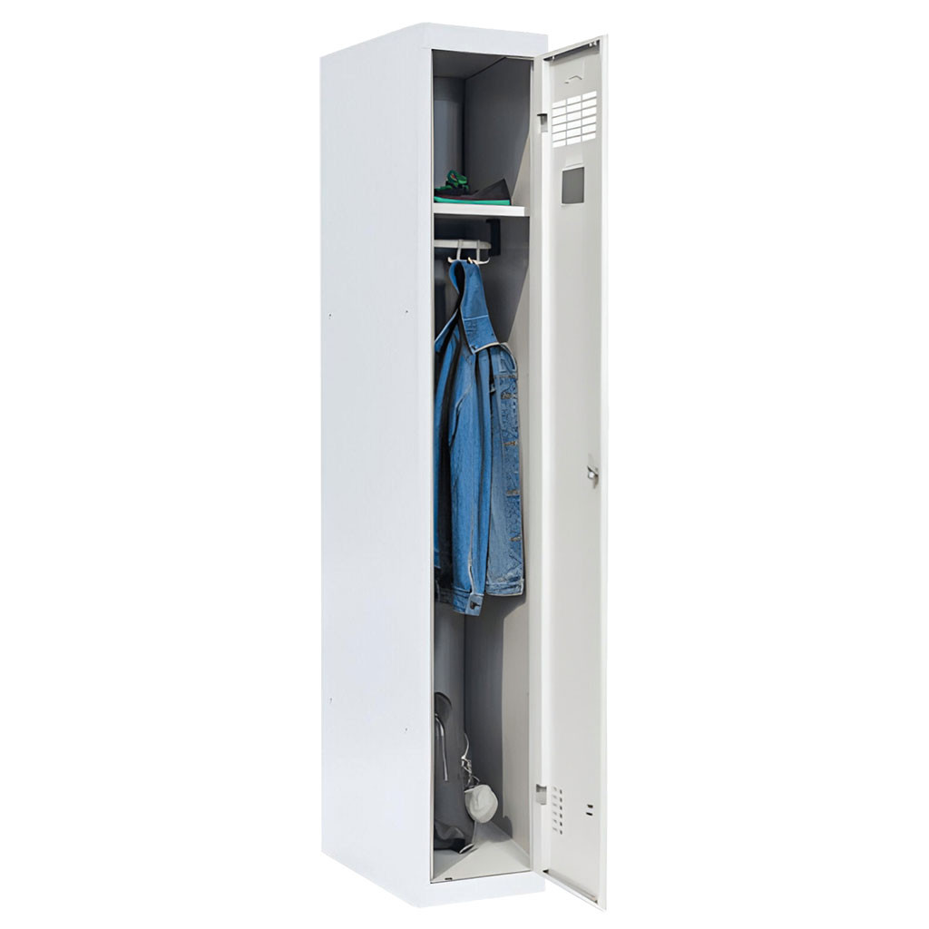 Skříň má montovanou ocelovou konstrukci s práškovou barvou RAL7035. Uvnitř je odkládací police, tyč na ramínka, držák na ručník nebo zrcátko a háčky na zavěšování šatů. Na dveřích jsou v horní i dolní části větrací otvory a bezpečnostní zámek (se 2 klíči).
