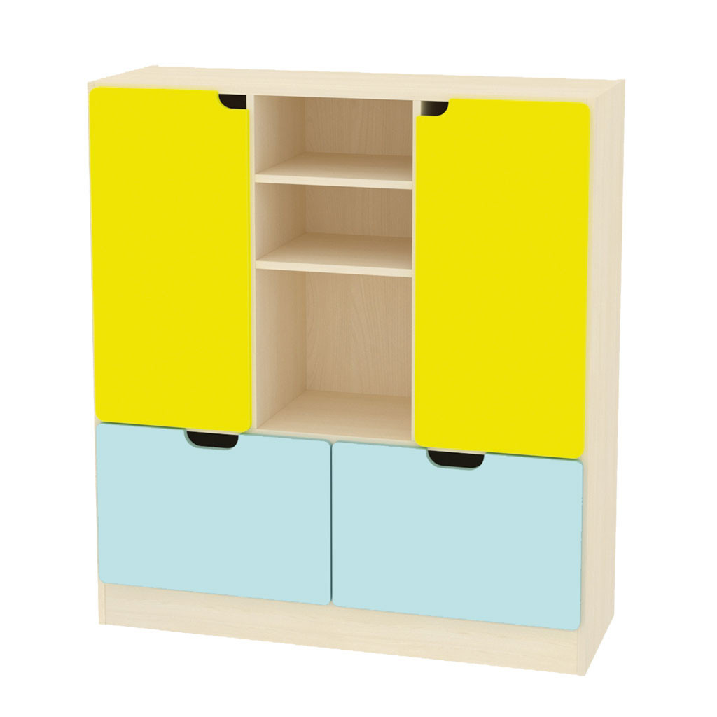 Kombinované 3D skříňky jsou vyrobeny z 18 mm DTD desky, která má zaoblenou ABS bezpečnostní hranu o tloušťce 2 mm. Dvířka jsou vyrobeny ze 16 mm MDF desky, jsou potaženy barevnou fólií a také mají zaoblenou hranu. Na dvířka se dají frézovat vzory, na výběr máte 92 motivů. Liší se typem korpusu, počtem a velikostí kontejnerů a dvířek. Máte možnost vybrat si skříňku podle našeho návrhu (obrázek), nebo si vytvořit vlastní barevnost skříňky. Vedle hlavního obrázku je přiložen typ korpusu. Na výběr máte korpus javor nebo buk.
