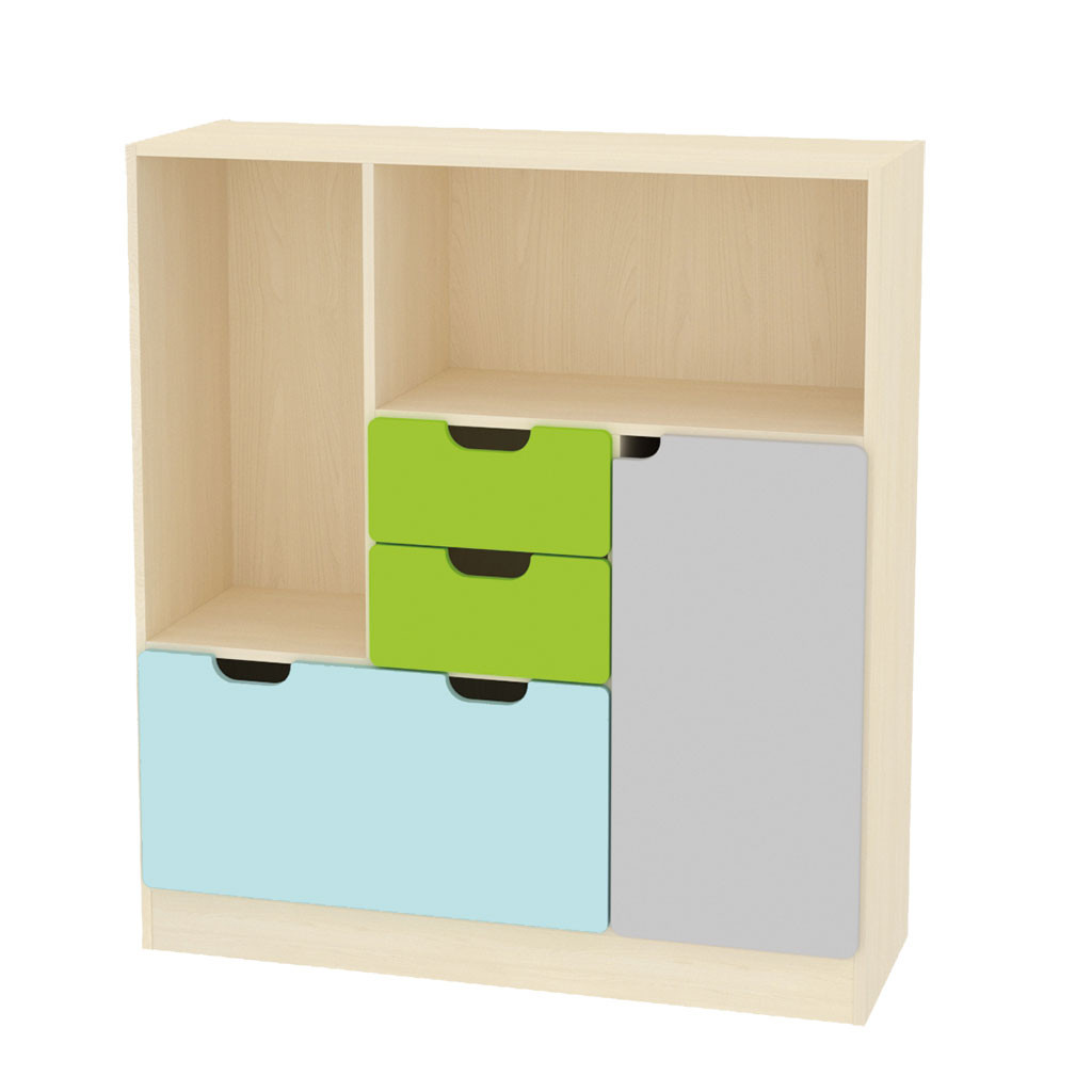 Kombinované 3D skříňky jsou vyrobeny z 18 mm DTD desky, která má zaoblenou ABS bezpečnostní hranu o tloušťce 2 mm. Dvířka jsou vyrobeny ze 16 mm MDF desky, jsou potaženy barevnou fólií a také mají zaoblenou hranu. Na dvířka se dají frézovat vzory, na výběr máte 92 motivů. Liší se typem korpusu, počtem a velikostí kontejnerů a dvířek. Máte možnost vybrat si skříňku podle našeho návrhu (obrázek), nebo si vytvořit vlastní barevnost skříňky. Vedle hlavního obrázku je přiložen typ korpusu. Na výběr máte korpus javor nebo buk.