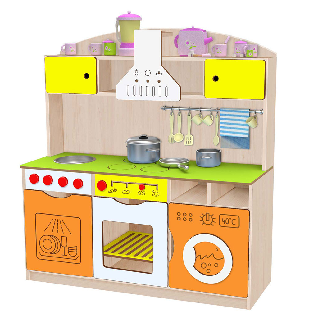 Dětská kuchyňka je vyrobena z 18 mm DTD desky a má zaoblenou bezpečnostní ABS hranu o tloušťce 2 mm. Na výběr máte korpus javor nebo buk. Dvířka jsou vyrobena ze 12 mm MDF desky. Na dvířka lze frézovat vzory. Kombinace modulů – trouba, mikrovlnka, myčka nádobí, digestoř. Do dvířek trouby je vložen rost z 12 mm MDF. V ceně kuchyňky je také nerezová miska a tyč na věšení kuchyňského nádobí.