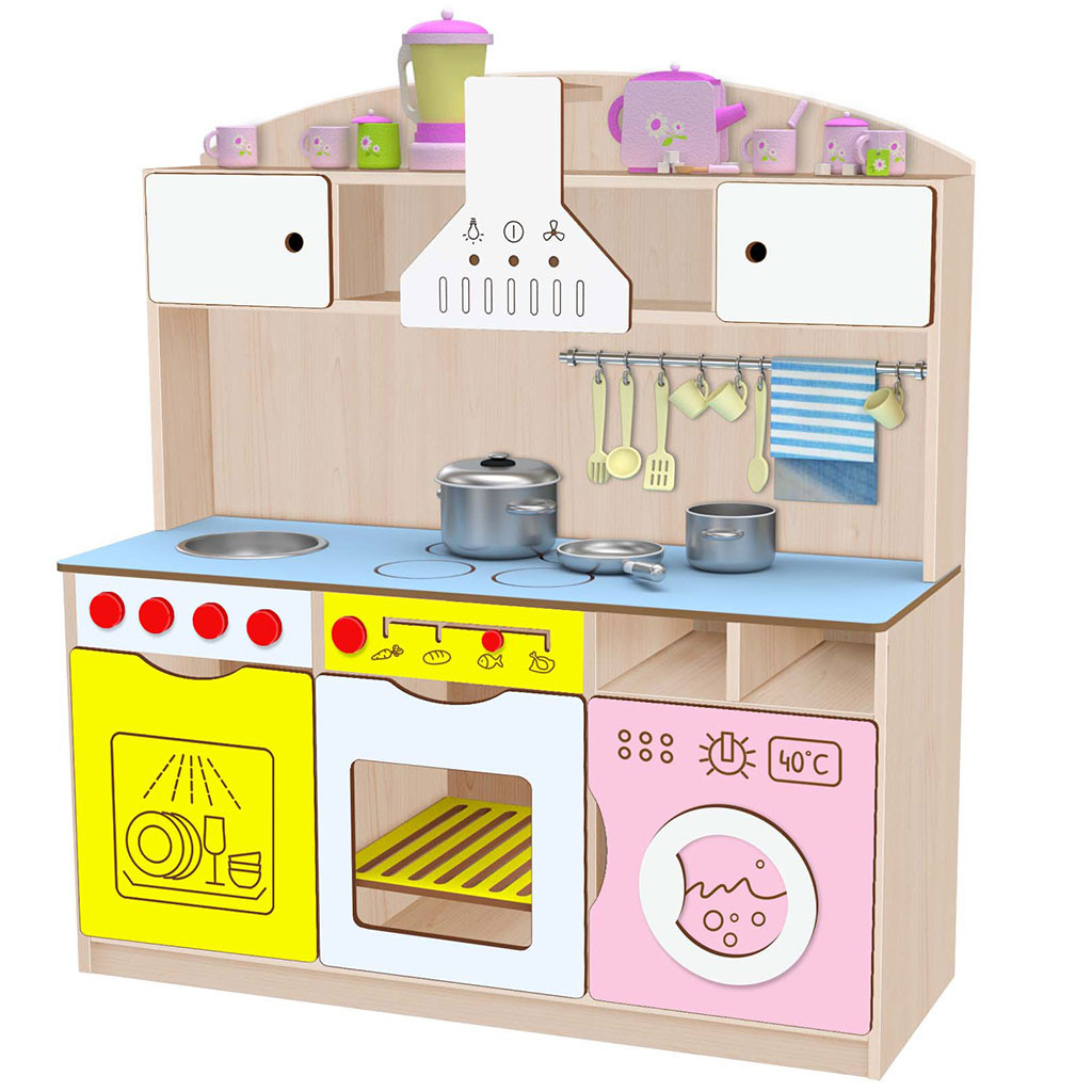 Dětská kuchyňka je vyrobena z 18 mm DTD desky a má zaoblenou bezpečnostní ABS hranu o tloušťce 2 mm. Na výběr máte korpus javor nebo buk. Dvířka jsou vyrobena ze 12 mm MDF desky. Na dvířka lze frézovat vzory. Kombinace modulů – trouba, mikrovlnka, myčka nádobí, digestoř. Do dvířek trouby je vložen rost z 12 mm MDF. V ceně kuchyňky je také nerezová miska a tyč na věšení kuchyňského nádobí.