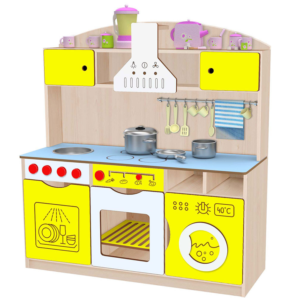 Dětská kuchyňka je vyrobena z 18 mm DTD desky a má zaoblenou bezpečnostní ABS hranu o tloušťce 2 mm. Na výběr máte korpus javor nebo buk. Dvířka jsou vyrobena ze 12 mm MDF desky. Na dvířka lze frézovat vzory. Kombinace modulů – trouba, mikrovlnka, myčka nádobí, digestoř. Do dvířek trouby je vložen rost z 12 mm MDF. V ceně kuchyňky je také nerezová miska a tyč na věšení kuchyňského nádobí.
