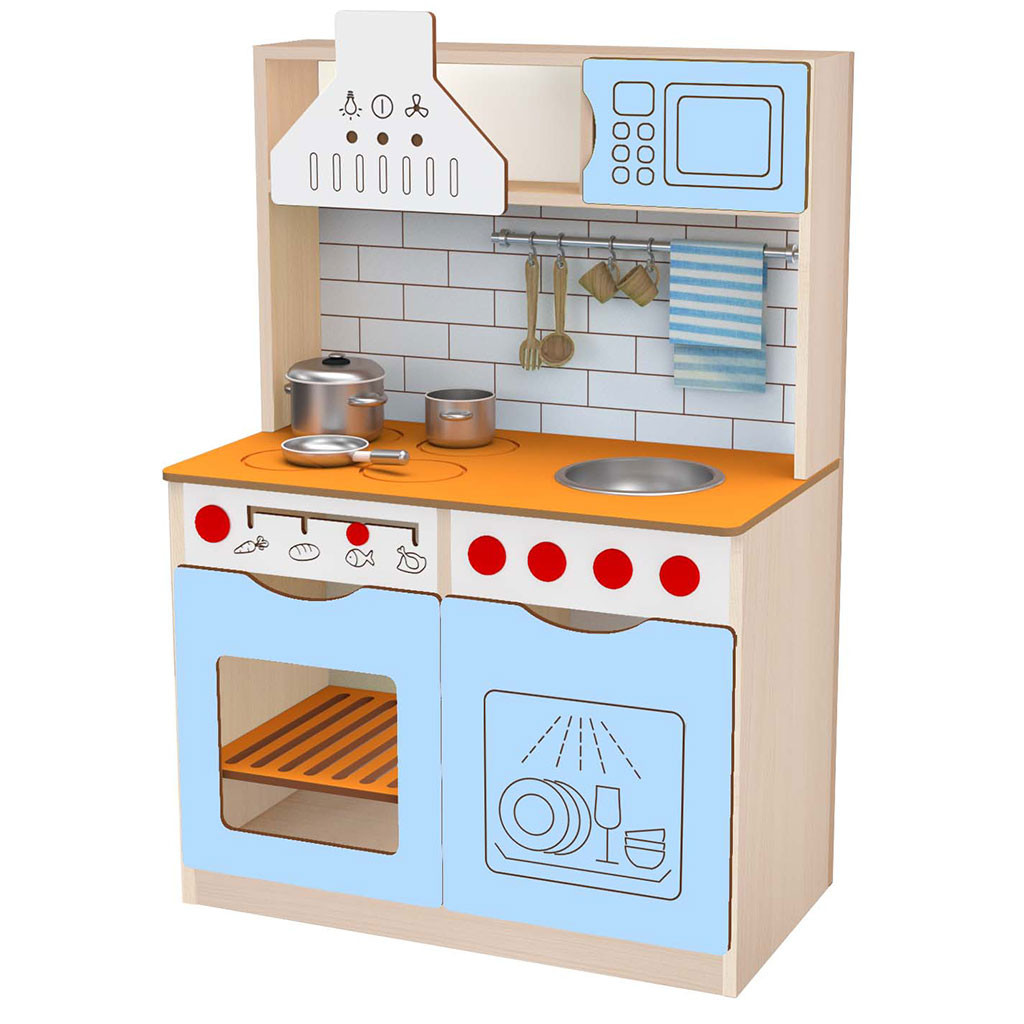 Dětská kuchyňka je vyrobena z 18 mm DTD desky a má zaoblenou bezpečnostní ABS hranu o tloušťce 2 mm. Na výběr máte korpus javor nebo buk. Dvířka jsou vyrobena ze 12 mm MDF desky. Na dvířka lze frézovat vzory. Kombinace modulů – trouba, mikrovlnka, myčka nádobí, digestoř. Do dvířek trouby je vložen rost z 12 mm MDF. V ceně kuchyňky je také nerezová miska a tyč na věšení kuchyňského nádobí.