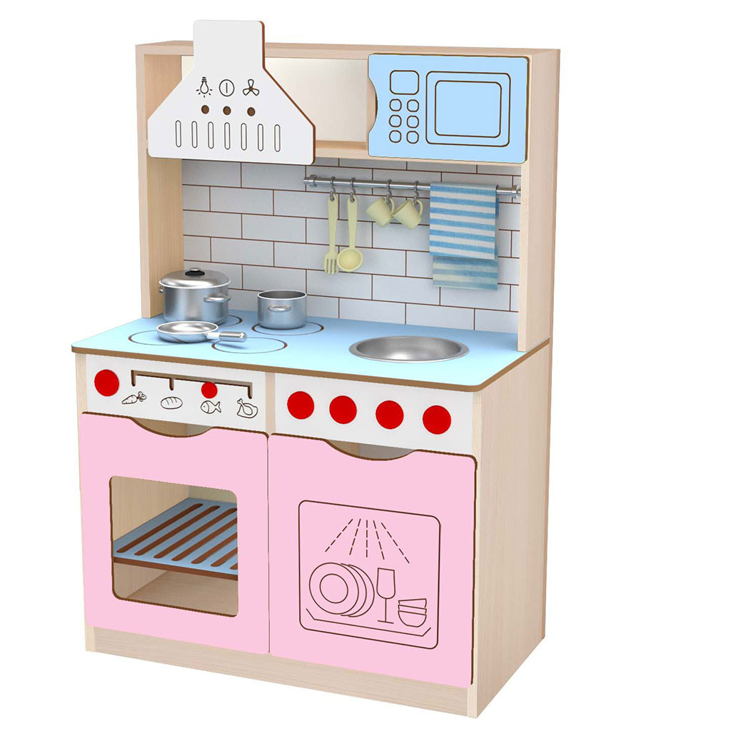 Dětská kuchyňka je vyrobena z 18 mm DTD desky a má zaoblenou bezpečnostní ABS hranu o tloušťce 2 mm. Na výběr máte korpus javor nebo buk. Dvířka jsou vyrobena ze 12 mm MDF desky. Na dvířka lze frézovat vzory. Kombinace modulů – trouba, mikrovlnka, myčka nádobí, digestoř. Do dvířek trouby je vložen rost z 12 mm MDF. V ceně kuchyňky je také nerezová miska a tyč na věšení kuchyňského nádobí.