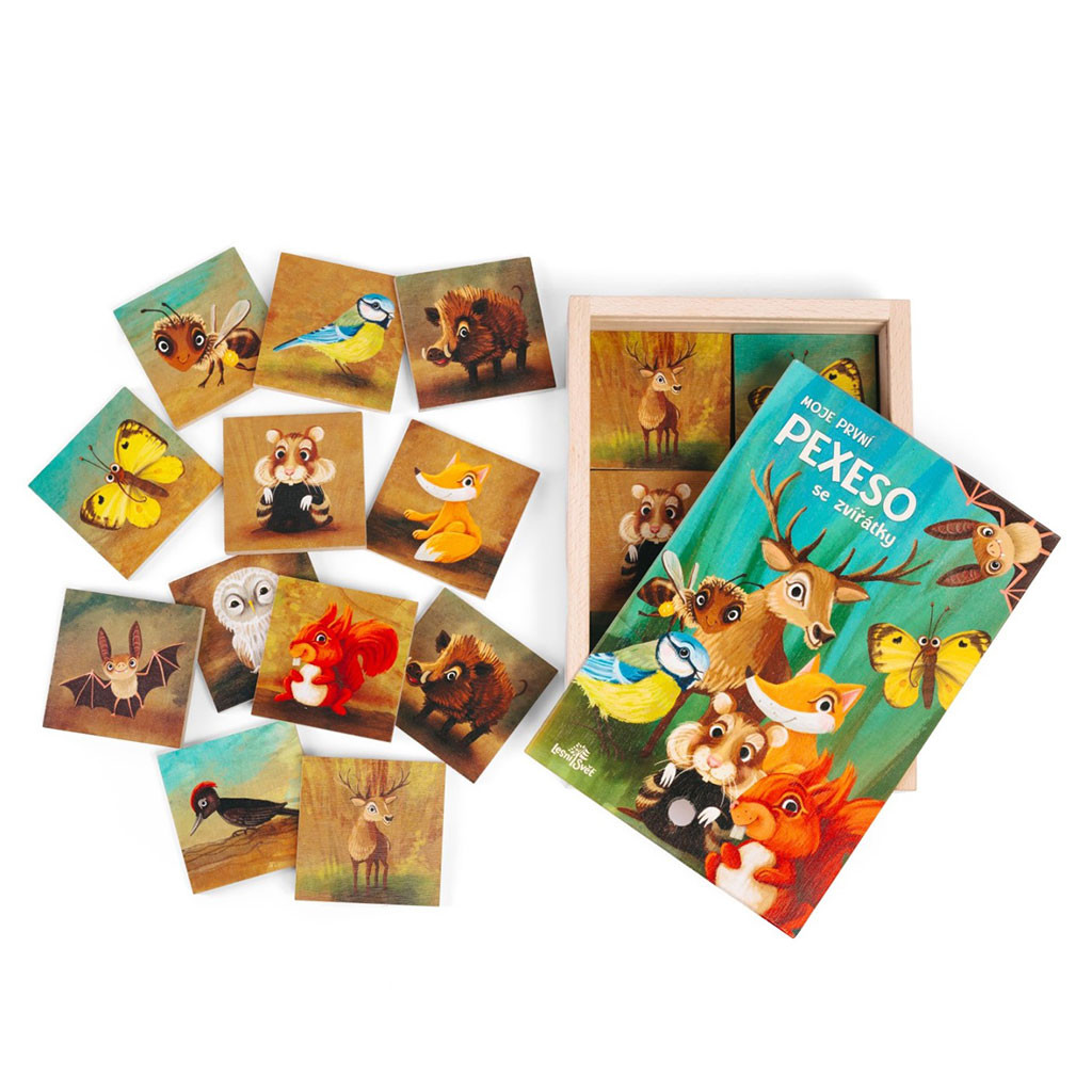 Balení obsahuje 24 ks o velikosti 7×7×0,7 cm. Baleno v dřevěné krabičce z masivu s vysouvacím víkem 23 x 5 x 16 cm. Autorem kreseb jsou čeští ilustrátoři. Druhy zvířátek: liška, beruška, divočák, včela, ledník, sova, žížala, veverka, myš, motýl, datel, štika. Materiál: dřevo. Věk: 3+.