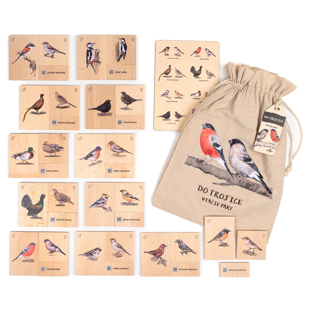 Balení obsahuje celkem 36 kostek ze dřeva ve třech rozměrech. Děti hledají ptačí páry a jejich název s QR kódem, který je prostřednictvím aplikace seznámí se zvukem a bližšími informacemi k danému ptáčkovi. Obsahuje těchto 12 ptačích párů: ťuhýk obecný, pěnkava obecná, strakapoud velký, kos černý, tetřeb hlušec, vrabec domácí, rehek zahradní, hýl obecný, bažant obecný, dlask tlustozobý, křivka obecná, kachna divoká. Baleno v látkovém sáčku o velikosti 30 x 40 cm. Součástí balení je dřevěná destička se správným řešením. Rozměry: 10 x 6,8/6,8 x 6,8/6,8 x 3,5 cm (z každého rozměru 12 kostek). Materiál: dřevo. Věk: 3+.