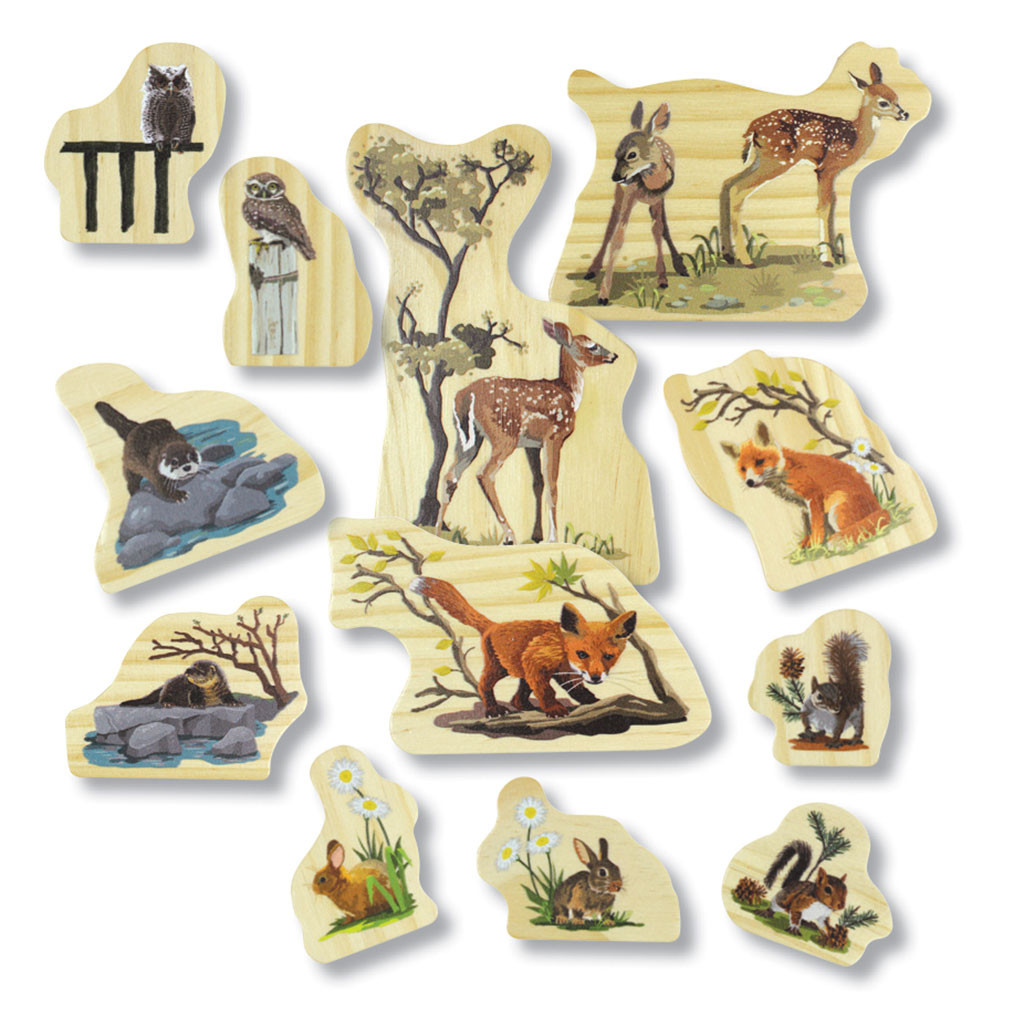 Ilustrovaná sada 12 oboustranných lesních zvířátek je dobrým způsobem, jak rozvíjet porozumění přírody. Ploché podstavce umožňují používání zvířátek ve vzpřímené poloze. Jedna strana každého kusu zobrazuje dospělého jedince, přičemž každá zadní strana zobrazuje mláďátko v jiné póze, což dětem umožňuje třídit a srovnávat zvířata na základě jejich vlastností. Jsou zde také stopy zvířat v přírodě, které poskytují podnět k diskusi. Sada obsahuje jelena, lišku, vydru, sovu, králíka a veverku. Rozměry: výška nejvyššího zvířátka 14,2 cm. Materiál: certifikované borovicové dřevo. Věk: 1,5+.