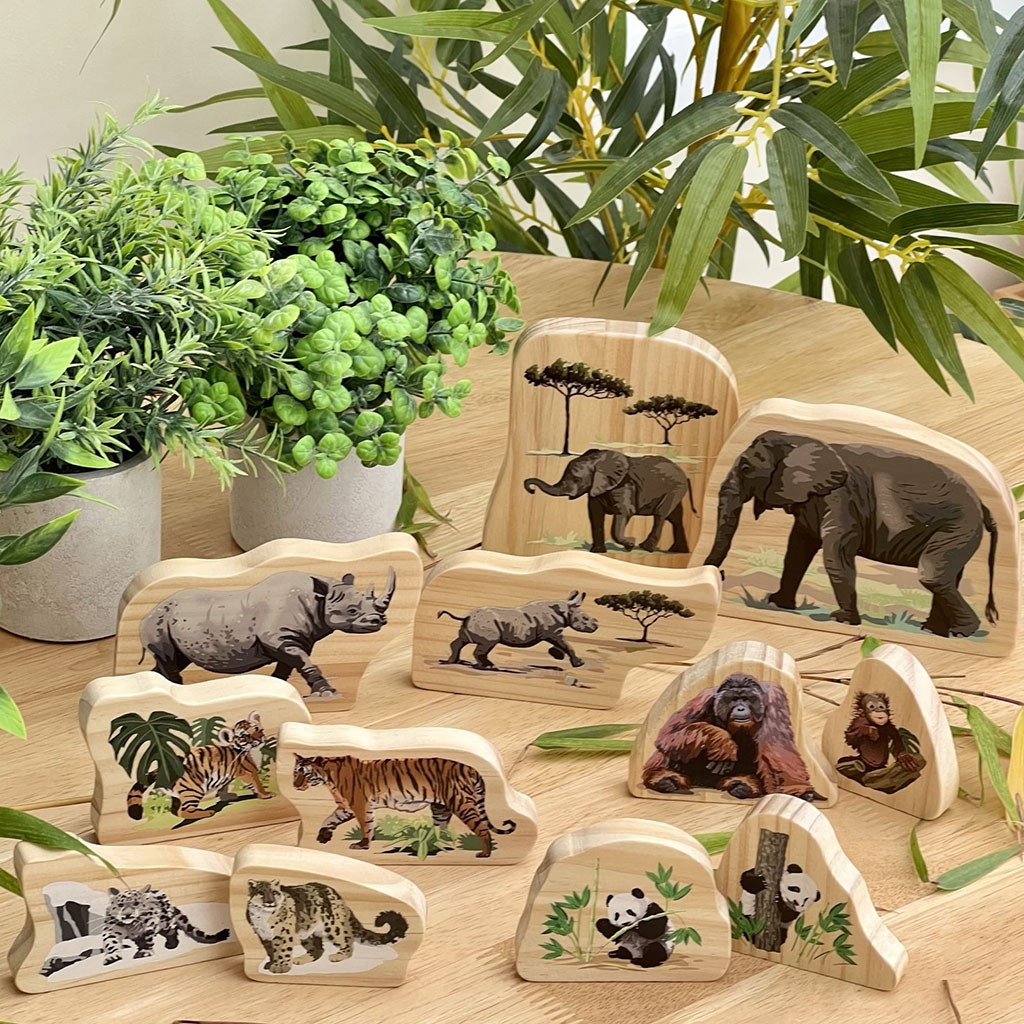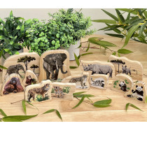 Ilustrovaná sada 12 oboustranných lesních zvířátek je dobrým způsobem, jak rozvíjet porozumění přírody. Ploché podstavce umožňují používání zvířátek ve vzpřímené poloze. Jedna strana každého kusu zobrazuje dospělého jedince, přičemž každá zadní strana zobrazuje mláďátko v jiné póze, což dětem umožňuje třídit a srovnávat zvířata na základě jejich vlastností. Jsou zde také stopy zvířat v přírodě, které poskytují podnět k diskusi. Sada obsahuje slona, orangutana, pandu, nosorožce, sněžného leoparda a tygra. Rozměry: výška nejvyššího zvířátka 15,5 cm. Materiál: certifikované borovicové dřevo. Věk: 1,5+.