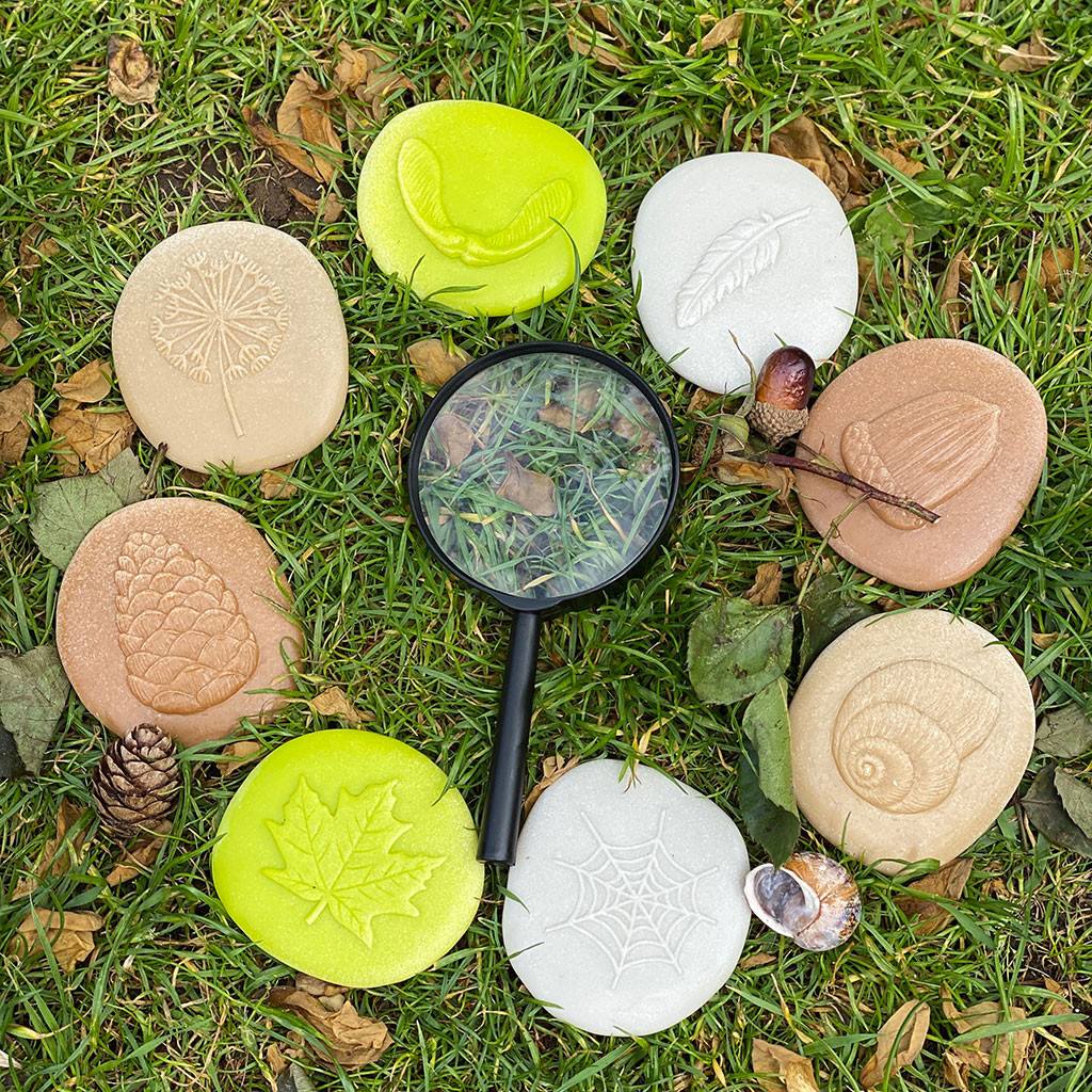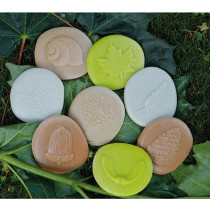 Realistická sada s vyobrazením osmi druhů (žalud, semínko pampelišky, pírko, kobliha, hlemýždí ulita, pavučina, javorový list, semínko javoru). Kameny jsou odolné, aby je bylo možné použít ke hraní ve vodě, půdě, blátě a jílu, snadno se čistí. Smyslové detaily na kamenech lze vidět ale také cítit. Udělejte si záznam otiskem v plastelíně, vosku, hracím cestě nebo si prokreslete vzor pomocí voskovek. Vyrobeno ze speciální směsi kamene. Rozměry kamene: 8 x 6,5 cm. Věk 2+.