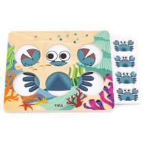Vložte kartu do dřevěné desky, zvedněte kruh s rukojetí, podívejte se na prvek vzoru a hádejte, který ze čtyř obrázků se shoduje se skrytým zvířátkem. Pokud neumíte uhodnout, zvedněte další kruh, aby jste odhalili podrobnosti. Kdo nejrychleji uhodne zvířátko, získává kartičku, a vyhrává ten, kdo nasbírá nejvíc kartiček. Hra rozvíjí pozorovací schopnosti a koncentraci. Balení obsahuje hrací desku a 10 oboustranných karet. Rozměry hrací desky: 22,5 x 18,5 x 3,3 cm. Materiál: dřevo/papír. Věk: 3+.