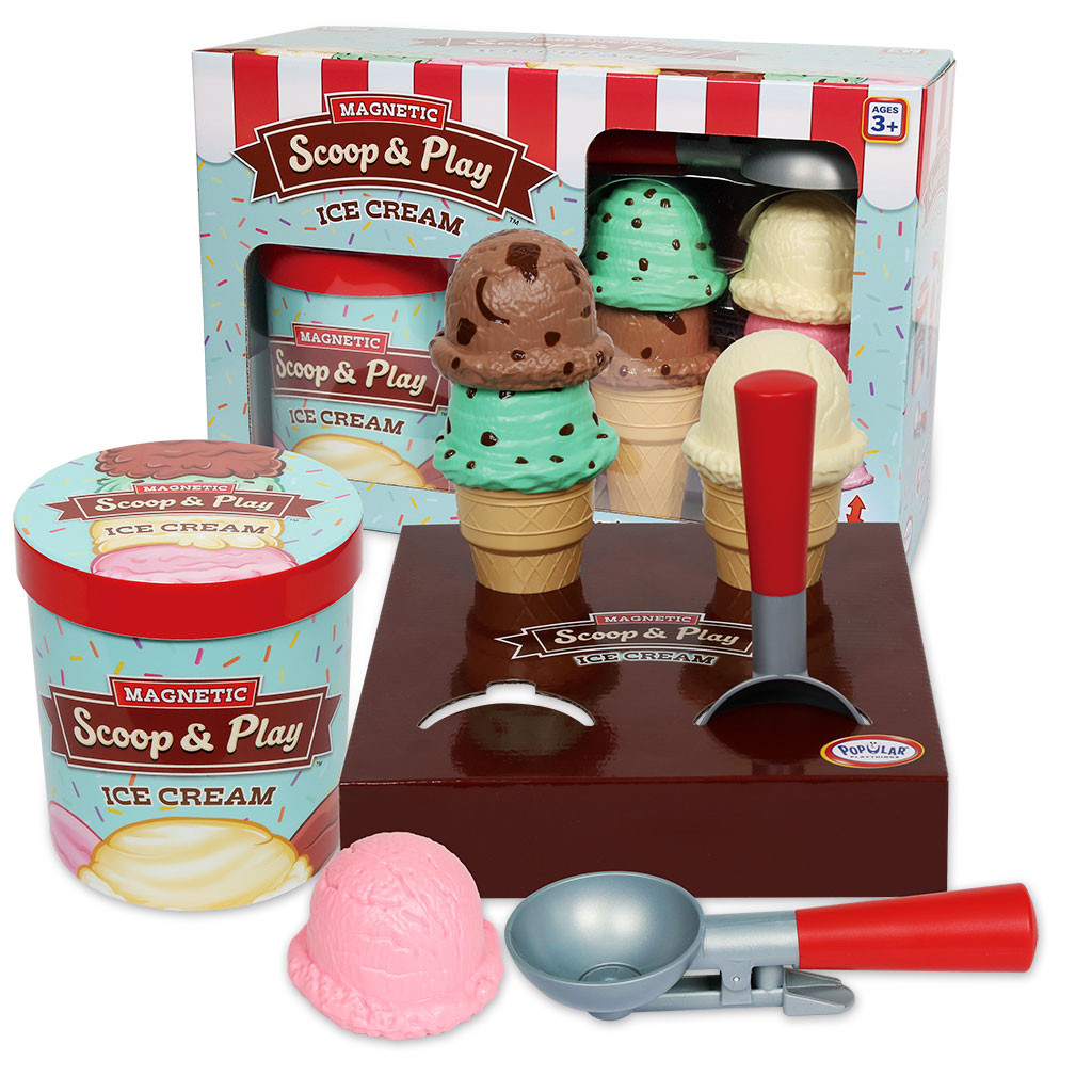 Magnetické spojení umožňuje dětem snadno nabírat zmrzlinu a položit ji na kornoutek. Ještě lepší je, že kopečky budou pevně držet na oplatku. Čtyři lahodné příchutě rozpoutají fantazii a kreativitu v této 9-dílné sadě (4 kopečky zmrzliny, 2 kornouty, 2 naběračky na zmrzlinu, skladovací nádoba). Hračka podporuje rozpoznávání barev, jemné motorické dovednosti, rozvoj jazyka a mnoho dalších dovedností. Rozměry balení: 35 x 23,5 x 13,5 cm, rozměry zmrzliny cca 20 cm. Materiál: plast/magnet. Věk: 3+.