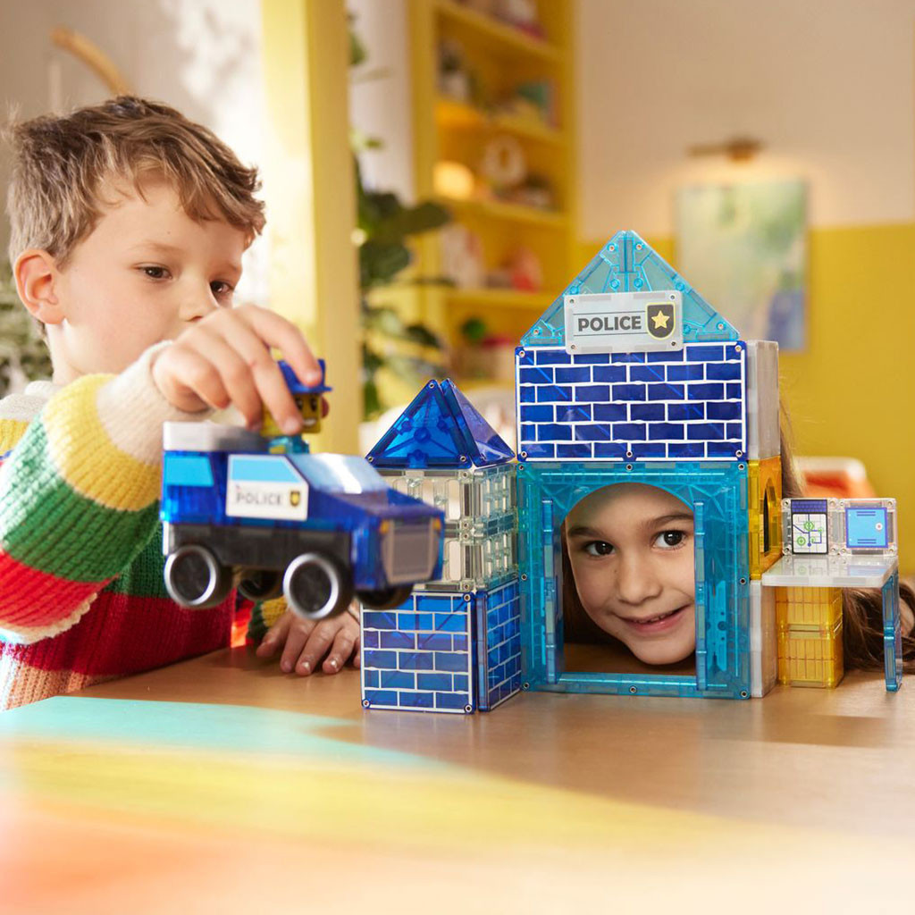 Se stavebnicí Police Station se každé dítě stává šéfem policie, designérem stanice i záchranářem v jednom. Výjimečná stavebnice, kde interaktivní světelně – zvukové dlaždice blikají a houkají a vytvářejí atmosféru skutečné akce. Kreativní hra, která rozvíjí prostorovou představivost, jemnou motoriku, matematické, prostorové a hmatové dovednosti. Podporuje děti v týmové práci a schopnosti řešení problémů. Průsvitné dílky jsou bezpečné a mají odolné provedení, aby vydržely nesčetné hodiny hraní a neobsahují BPA, ftaláty ani latex. Stavebnice je kompatibilní se všemi sadami MAGNA-TILES®. Balení obsahuje 35 dílků včetně 2 figurek policistů a autíčka. Rozměry balení: 30,5 x 8 x 30,5 cm. Materiál: plast. Věk: 3+.