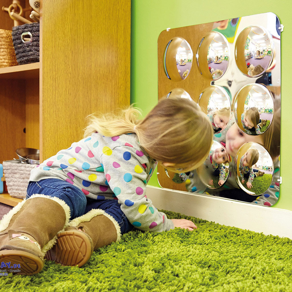 Devět konvexních zrcadlových výdutí umožňuje pozorovat sebe a předměty kolem nich. Skvělá zábava pro děti, které objevují sebe a své okolí v zrcadle. Zrcadla se zaoblenými rohy jsou vhodná do interiéru i exteriéru. Včetně montážního materiálu. Rozměry: 49 x 49 x 2,5 cm. Materiál: akryl. Věk: 1+.