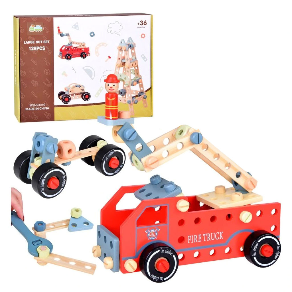 Stavebnice inspirovaná Montessori je vzdělávací hračka, která spojuje zábavu s učením. Sada umožňuje stavět různé modely, jako například helikoptéru, letadlo, auto nebo cokoli podle dětské fantazie. Díky různobarevným šroubům a maticím se děti učí rozpoznávat barvy a spojovat prvky, což rozvíjí logické myšlení, podporuje představivost a rozvíjí manuální dovednosti, motorickou koordinaci a kreativitu. Obsah: 129 dílků, příručka s nápady. Rozměry: hasičské auto s žebříkem 32 x 16 x 38 cm, proužek s otvory 11,5 x 2,5 x 0,5 cm, kruh 6 x 2,5 cm, šrouby 3 - 4,5 cm. Materiál: dřevo. Věk: 3+.