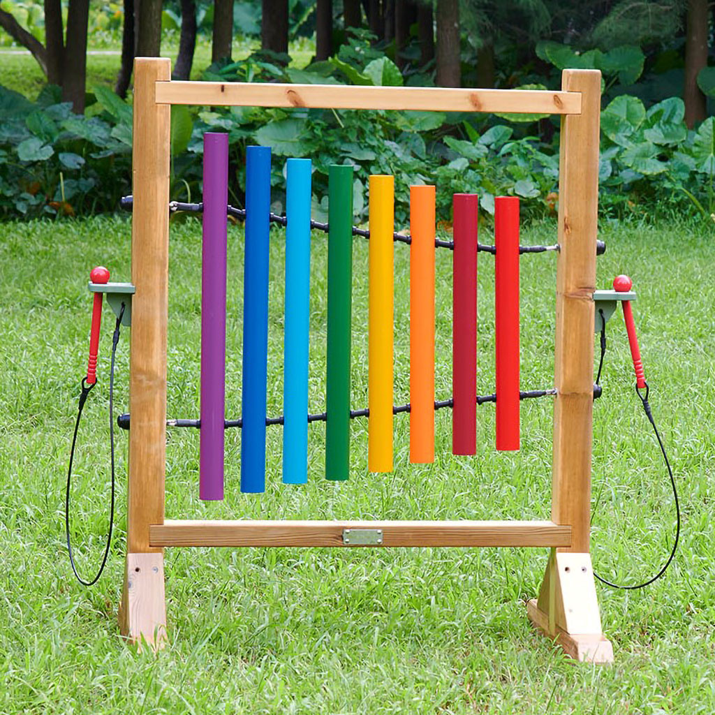 Sada 8 duhově zbarvených hliníkových trubic umístěných vertikálně v robustním borovém rámu. Trubice jsou vyrobeny z melodické hliníkové slitiny a jsou upevněny na drátech, které umožňují, aby noty rezonovaly s ostrým zvukem při poklepávání nebo úderu jedním ze 2 připojených kladiv. Noty jsou naladěny a označeny tak, aby tvořily kompletní stupnici od C do C. Dřevo je upraveno pro použití v interiéru i exteriéru a je vysoce odolné vůči povětrnostním vlivům. Výška 120 cm je vhodná pro všechny děti v MŠ a na 1. stupni ZŠ. Rozměry produktu: (d x š x v): 94 x 62 x 120 cm. Materiál: dřevo/kov. Věk: 3+.