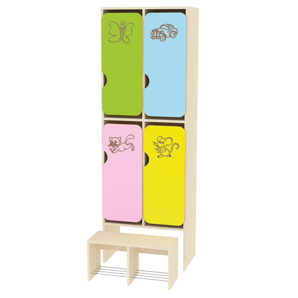 Šatny jsou vyrobeny z 18 mm DTD desky, která má zaoblenou ABS bezpečnostní hranu o tloušťce 2 mm. Dvířka jsou vyrobena ze 12 mm MDF desky, mají zaoblenou hranu. Na dvířka lze frézovat vzory, na výběr máte 92 motivů. Součástí šatny je odnímatelná lavička s roštem. Každá přihrádka má jeden dvojitý háček, který si, za příplatek 80 Kč na jednu buňku, můžete zaměnit za tyč na ramínko. V tom případě za kód připište písmeno T. Vybrat si můžete korpus javor nebo buk.