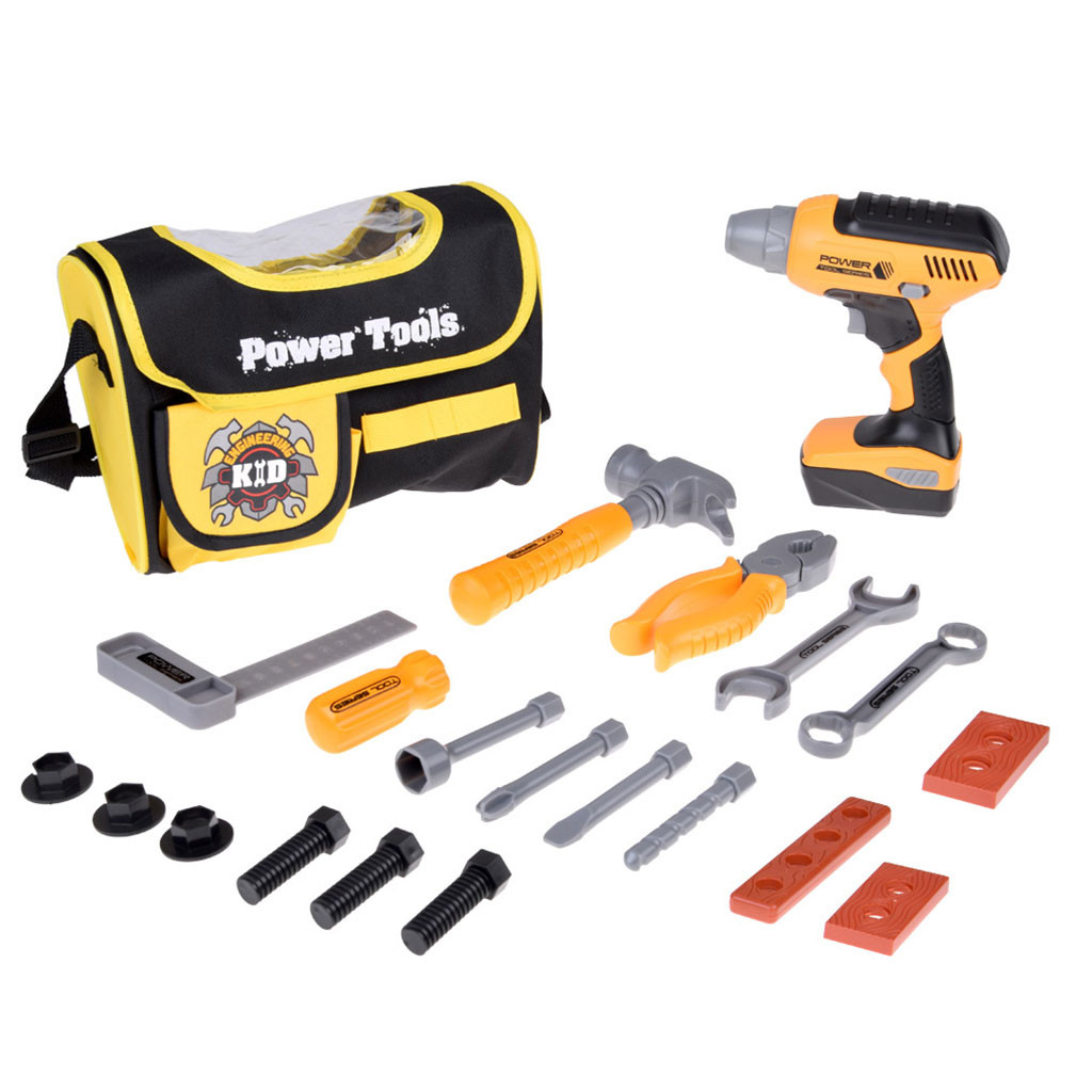 Nářadí je vyrobeno z vysoce kvalitního plastu ve výrazné žluté a šedé barvě a pro děti je naprosto bezpečné. Navíc, vrtačka/šroubovák je napájena bateriemi, takže hra je neuvěřitelně realistická. Vrtačka funguje stejně jako skutečná, během vrtání uslyšíte charakteristické zvuky doprovázené svítící bílou LED diodou. A stejně jako skutečná vrtačka má i vysouvací „baterii“ (kde jsou baterie vloženy). Po hraní je jednoduše uložte do prostorné tašky, čímž zajistíte, že se neztratí. Sada obsahuje: prostornou tašku přes rameno se zapínáním na suchý zip a další kapsou, bateriovou vrtačku/šroubovák, 3 vyměnitelné bity, kladivo, šroubovák, kleště, klíč, nástrčkový klíč, kreslící metr, 2 šrouby, 2 krytky šroubů, 3 plastové prvky imitující dřevěné desky. Vrtačka je napájena: 3 x AAA bateriemi (nejsou součástí balení). Tato sada nářadí podporuje kreativitu, stimuluje představivost a rozvíjí manuální dovednost dětí. Rozměry: vrtačka cca 18 x 15 x 5 cm, kladivo 17,5 cm, dlouhé klíče, šroubovák, kleště 15 cm dlouhé, taška 25 x 17 x 11 cm, popruh nastavitelný od cca 55 cm do cca 105 cm. Materiál: plast/textil. Věk: 3+.