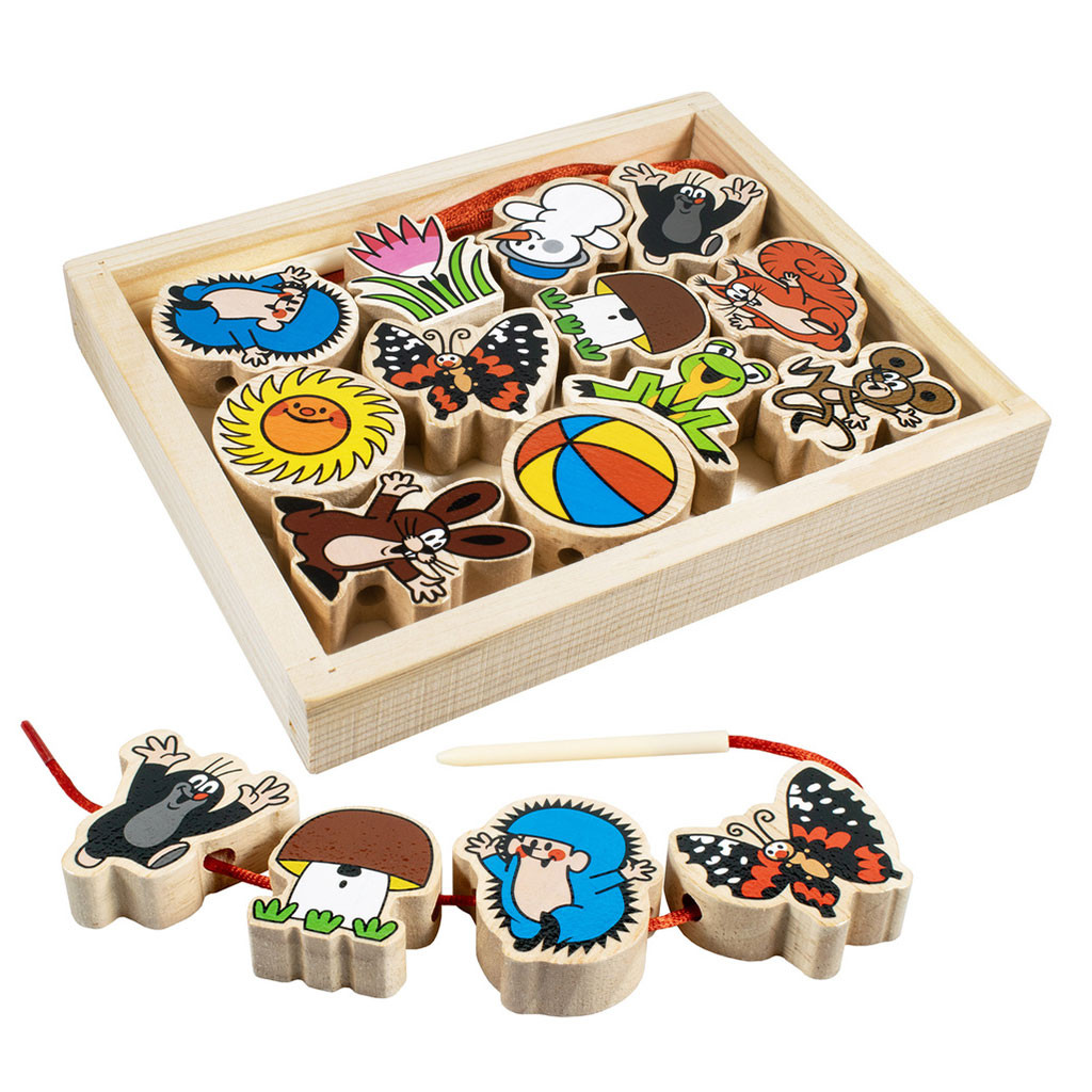 Převlékání dřevěných dílků postaviček Krtečka a jeho kamarádů rozvíjí u dětí kreativitu, trpělivost a jemnou motoriku rukou. Obsah balení: 12 dřevěných dílků s potiskem a 1 šňůrka s dřevěnou jehlou. Baleno v dřevěné krabici o rozměrech 18 x 15 x 2 cm. Materiál: dřevo/tkanina. Věk: 3+.