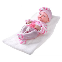 Hlava, nohy a ruce jsou vyrobeny z měkkého plastu. Korpus je vyroben z měkkého přírodního materiálu s výplní a díky vzpřímené opěrce může sedět vzpřímeně. Rozměry panenky: 43 x 24 x 13 cm. Rozměry deky: 33 x 33 cm. Materiál: plast/textil. Věk: 2+.