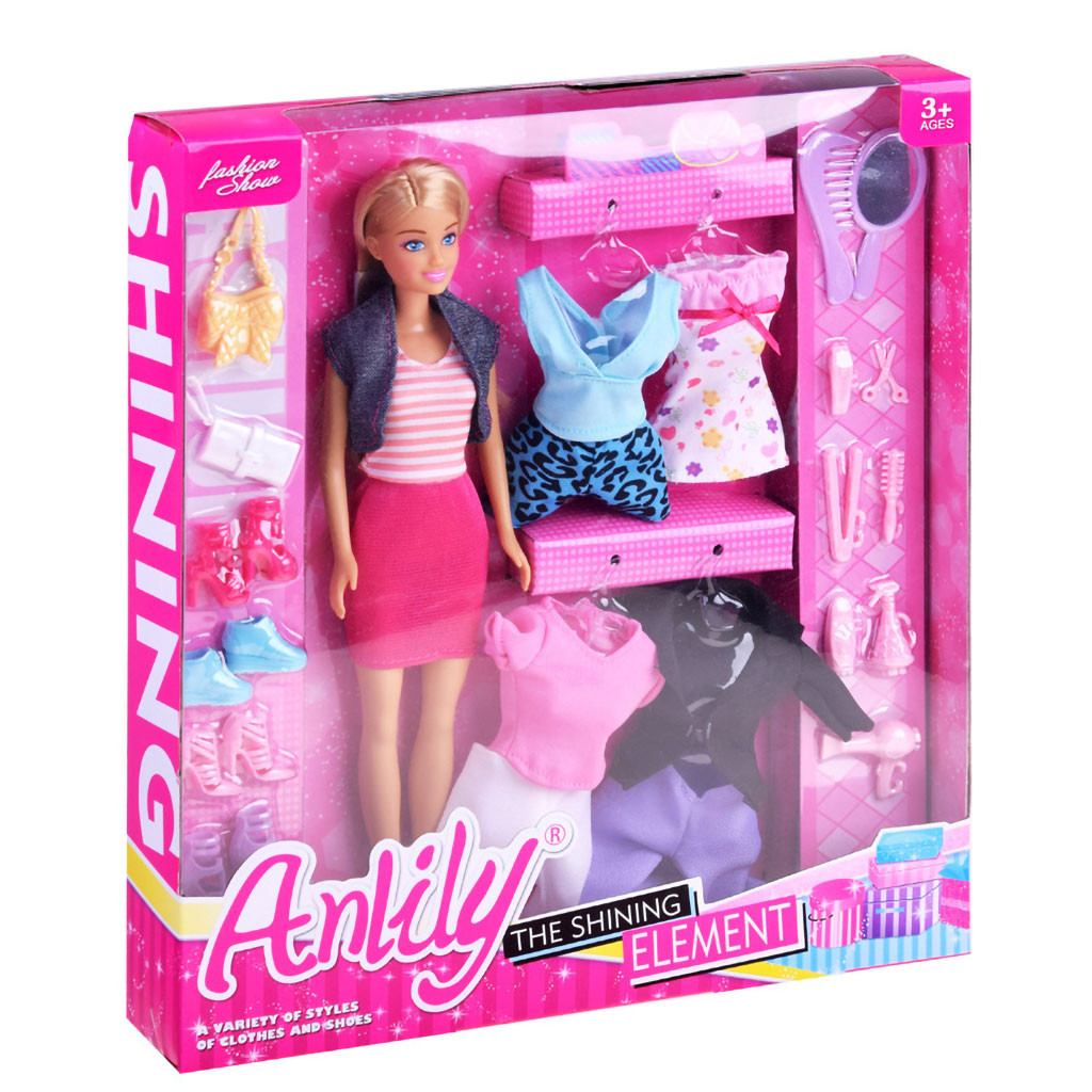 Panenka s dlouhými vlasy, s oblečením a doplňky. Bohatě vybavená sada obsahuje různé oblečení, šaty, trička, kalhoty, elegantní i sportovní boty, kabelky a vlasové doplňky (fén, kartáč na vlasy, žehlička, nůžky, holící strojek, zrcátko). Rozměry: výška panenky 30 cm. Materiál: plast/látka. Věk: 3+.