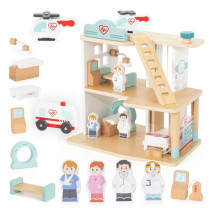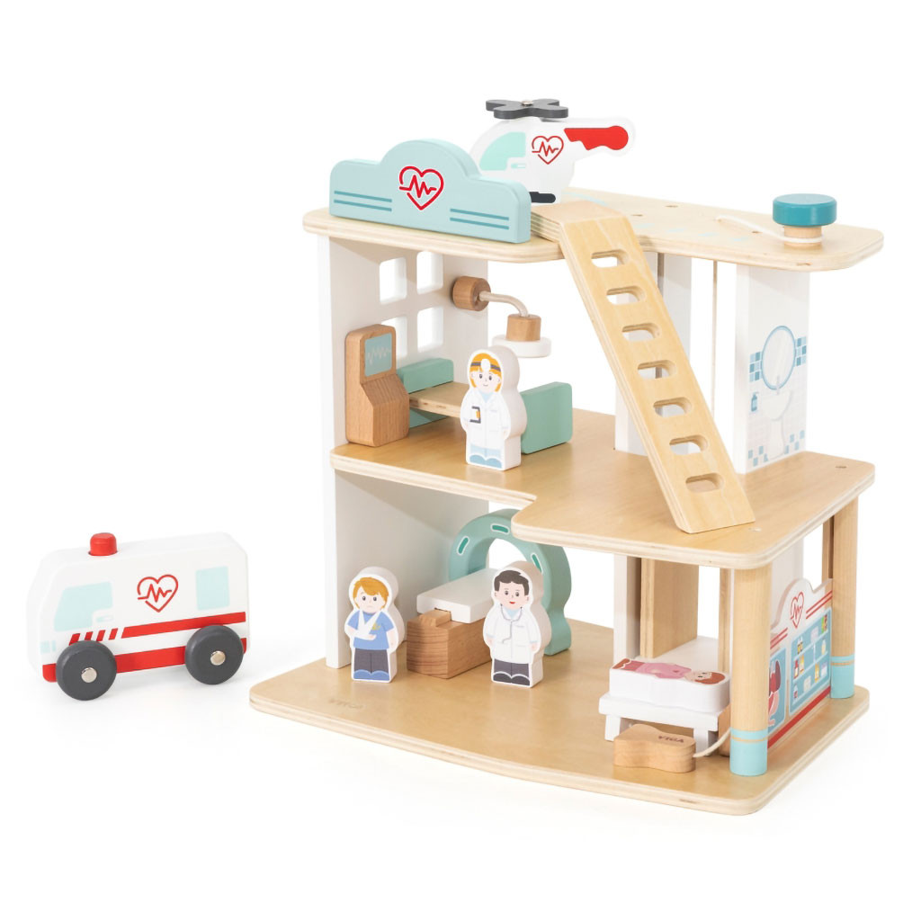 ato bohatě vybavená třípatrová stavba poskytne dětem hodiny kreativní hry při záchraně životů a péče o pacienty. Díky rozmanitým prvkům si děti mohou vytvářet realistické lékařské scénáře a zároveň rozvíjet empatii, jemnou motoriku a sociální dovednosti. Přízemí je kompletně vybaveno CT skenerem, ultrazvukem a úložným prostorem pro léky. Druhé patro má detailně zpracovaný operační sál a ve třetím patře je přistávací plocha pro záchranný vrtulník. Sada obsahuje 15 ks příslušenství: sanitku, vrtulník, figurky lékaře, sestry a pacienty, nemocniční lůžka a zdravotnické vybavení. Rozměry: 33 x 32,5 x 22,5 cm. Materiál: dřevo. Věk: 3+.