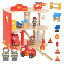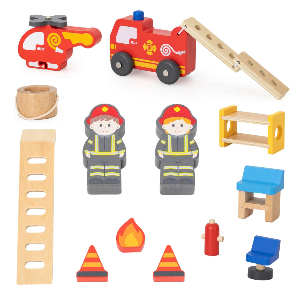 Třípatrová prostorná a barevná stanice je díky různým prvkům a úrovním pro děti velmi atraktivní hračkou. Děti mohou vytvořit nespočet záchranných scénářů o pomáhání druhým, čímž si rozvíjejí kreativitu a sociální dovednosti. Prostorné přízemí je s prostorem pro hasičské auto a úložným prostorem pro potřebné nářadí, druhé patro je s útulnou oddechovou zónou pro hasiče, funkčním zvonem a skluzavkou pro rychlou reakci na poplach a třetí patro je s přistávací plochou pro hasičský vrtulník. Sada obsahuje 14 ks: dřevěná 3-patrová hasičská stanice, hasičské auto, hasičský vrtulník s nádrží na vodu, 2 figurky hasičů, plamen, 2 dopravní kužely, hasicí přístroj a nábytek stanice: postel, stůl, židle. Rozměry: 33 x 32,5 x 22,5 cm. Materiál: dřevo. Věk: 3+.