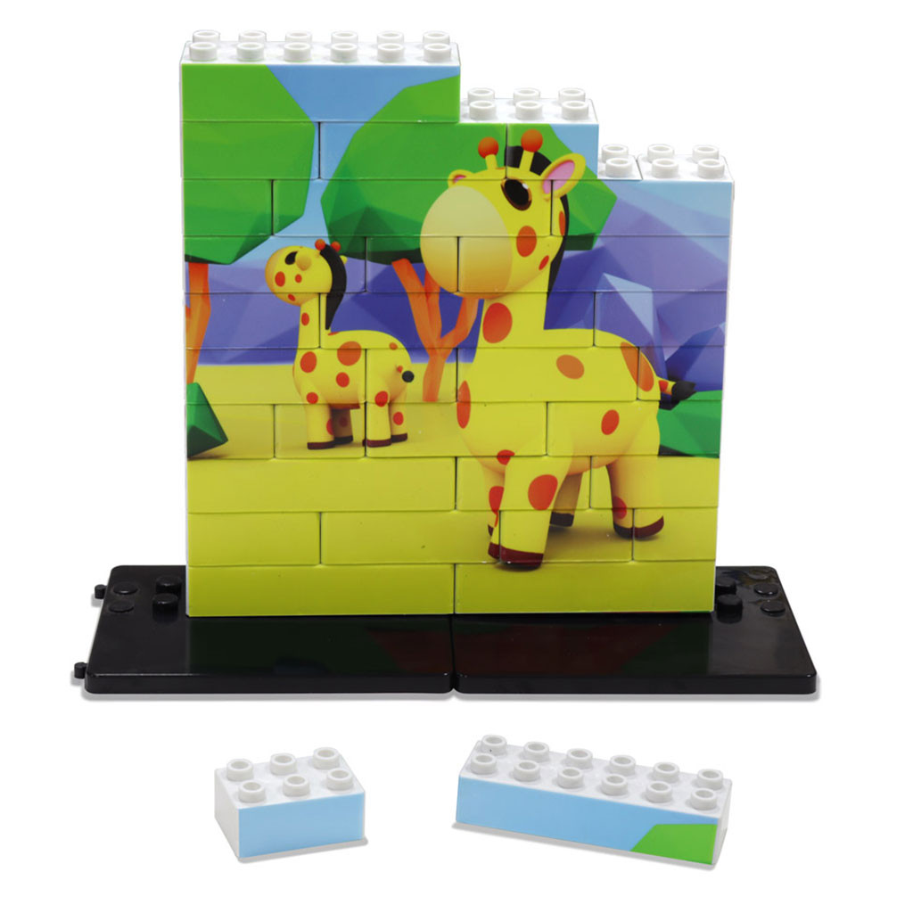 Vertikální puzzle tvořeny stavebními dílci různých velikostí. Poskládejte si z kostek veselý motiv zvířátek. Stavební dílky lze použít nejen na stavění vertikálních puzzlí, ale i jako stavebnici na rozvoj a kreativitu. Obsahuje 32 kusů, 2 podložky. Materiál: plast. Věk: 3+.