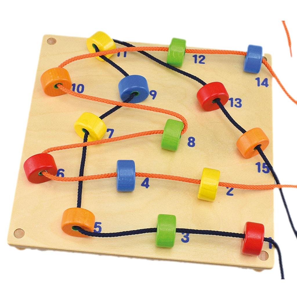 Na hrací desce je připevněno 15 barevných, očíslovaných kroužků. Desku lze využít mnoha způsoby, např. děti navlékají šňůrku jen přes určené barevné kroužky, nebo navlékají šňůrku jen přes sudá či lichá čísla, popřípadě ji využijí na základní matematické příklady sčítání a odčítání. Hra trénuje jemnou motoriku, logické myšlení, dovednost, kreativitu, teorii barev a rané matematické znalosti. Součástí balení jsou také dvě šňůrky, každá o délce 150 cm. Rozměry: 24,5 x 24,5 cm. Materiál: dřevo. Věk: 3+.