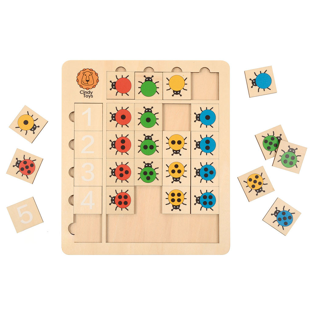 Puzzle s čísly a beruškami pomáhá dětem naučit se barvy, čísla, počítat a rozpoznávat směr. Čísla 1 až 5 jsou v levém sloupci a horní řadu lze použít pro umístění barevných berušek. Cílem je uspořádat 20 berušek ve správných barvách a se správným počtem teček tak, aby jejich hlavy směřovaly správným směrem. Tato hra podporuje výuku barev, rozpoznávání čísel a srovnávání množství. Hravou formou posiluje základní matematické dovednosti, postřeh a jemnou motoriku. Rozměry: 21 x 24,5 x 8 cm. Materiál: březová překližka. Věk: 3+.