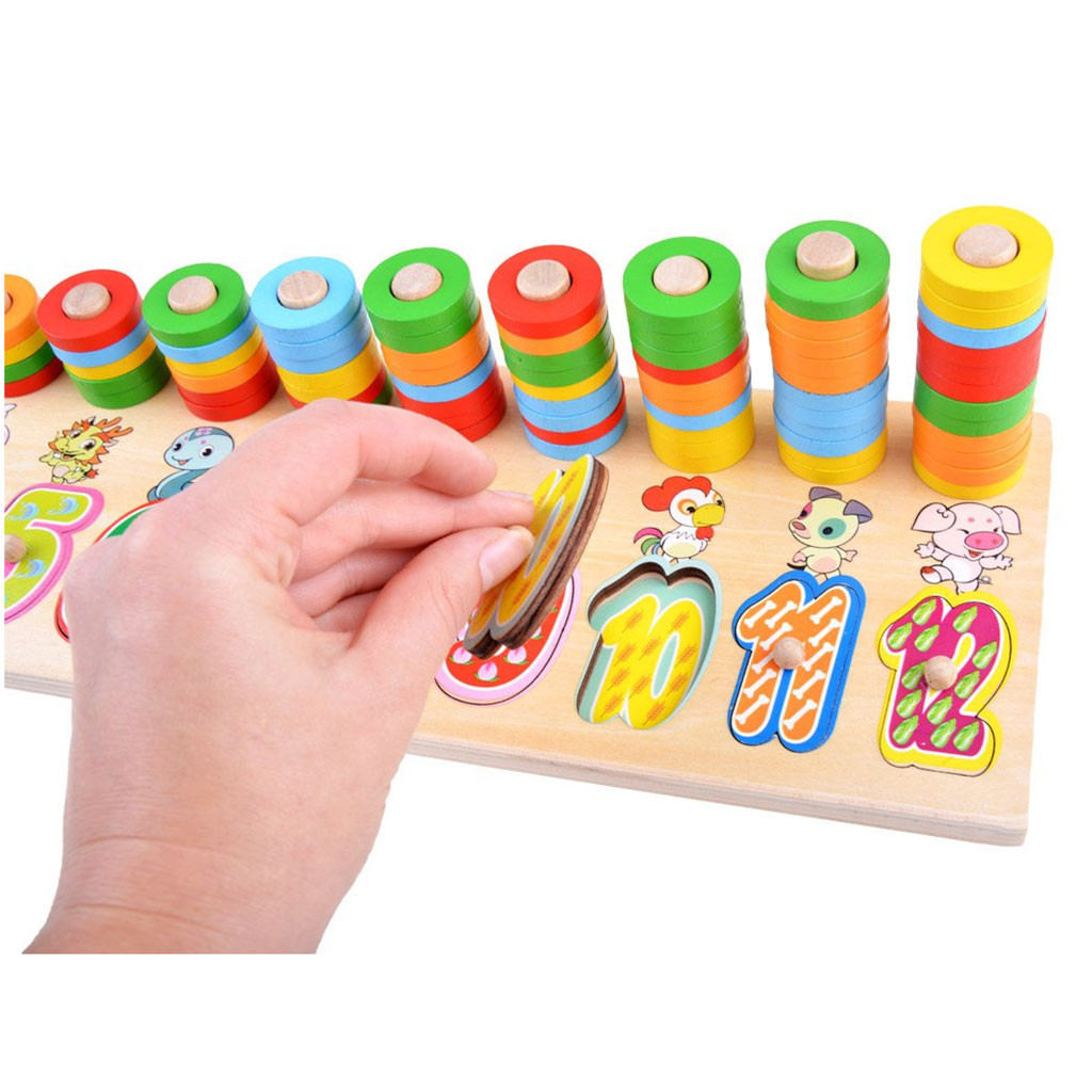 Barevná dřevěná skládačka s čísly a zvířátky je skvělý způsob, jak děti učit čísla, barvy a názvy zvířat hravou formou již od útlého věku. Děti umisťují správný počet barevných disků na kolíky a vkládají správné číslo do otvoru před kolíkem. Usnadňují to i obrázky zvířátek, které jim zároveň na číslech ukáží, jaká jsou jejich oblíbená jídla. Skládačka podporuje učení, stimuluje představivost, zlepšuje koncentraci, rozvíjí manuální zručnost a učí přiřazovat barvy a vzory. Také se může použít jako první počítadlo. Rozměry: deska: 45 x 12,5 x 7,5 cm, číslo 5 x 3 cm. Materiál: dřevo. Věk: 3+.