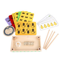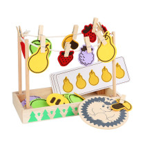 Vzdělávací hra "Ježko" je hrou patřící do skupiny Montessori hraček. Nabízí dětem neotřelý způsob poznávání ovoce a zeleniny a později jim zábavným a hravým způsobem pomáhá představit si počáteční pojmy matematiky. Děti mohou měkké, na dotek příjemné ovoce nebo zeleninu „sušit“ pomocí malých kolíčků. Při hře se děti připravují na setkání s číslicemi a aritmetickými znaménky. Hra podporuje smyslové vnímání díky interakci s prvky z různých materiálů, jako je dřevo, plsť a lano a také si rozvíjí jemnou motoriku. Balení obsahuje: základnu se 4 sloupky, 10 dřevěných kolíčků, ježka na zadávání úkolů, 6 oboustranných karet s předlohami, perforované barevné podložky z plsti s ovocem a zeleninou, podložky s číslicemi a matematickými znaménky, sáček. Rozměry složené herní sady: 30 x 16 x 22 cm, Ø ježka 14 cm. Rozměry kartiček: 22,5 x 8,5 cm. Rozměry ovoce a zeleniny cca 6-9 x 5-7 cm. Materiál: dřevo/plst. Věk: 3+.