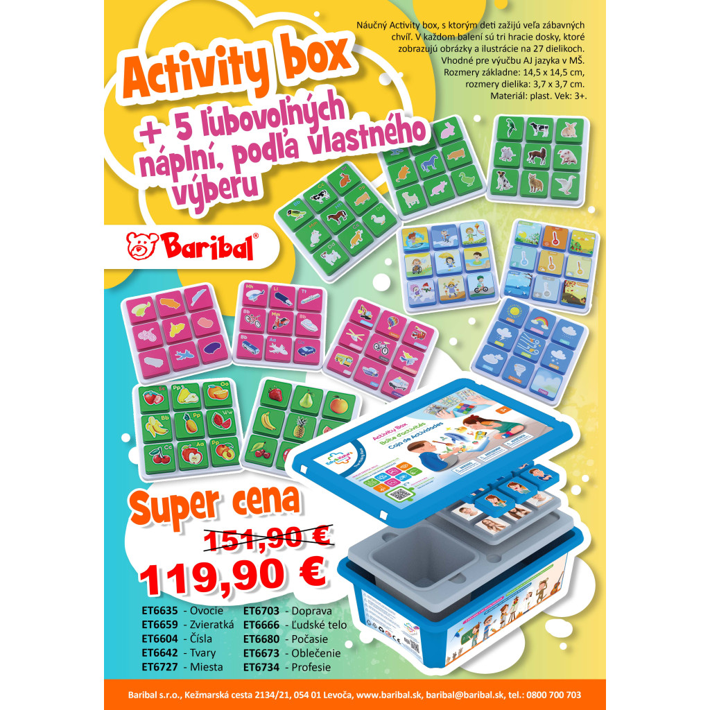 Naučný Activity box, se kterým děti zažijí spoustu zábavných chvil. V každém balení jsou tři hrací desky, které zobrazují obrázky a ilustrace na 27 dílcích. Rozměry základny: 14,5 x 14,5 cm, rozměry dílku: 3,7 x 3,7 cm. Vhodné i pro výuku AJ jazyka v MŠ. Materiál: plast. Věk: 3+.
