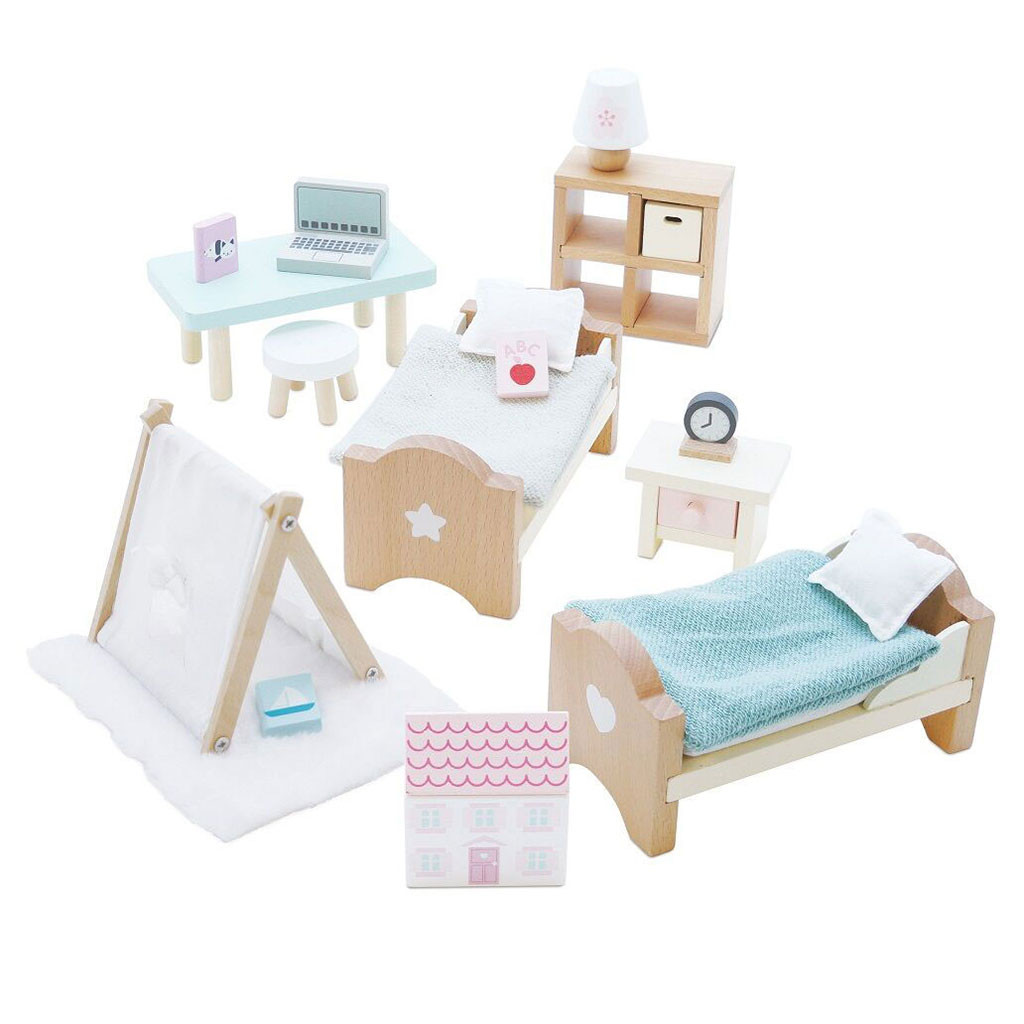 24 - dílná sada nábytku do dětského pokoje je vyrobena ze dřeva s certifikací FSC®, s poutavým moderním designem. V této sadě děti najdou veškerý nábytek a vybavení, které potřebují do dětského pokoje pro panenky. Od postelí s polštáři a peřinami, nočního stolku s lampičkou, židle, koberce nebo dekorace. Dřevěné detaily, realistický design a jemné pastelové barvy zajišťují, že dětský pokoj ve vašem domečku pro panenky bude vypadat přitažlivě a stylově. Rozměry postele: 6,5 x 13 x 6 cm. Materiál: dřevo. Věk: 3+.